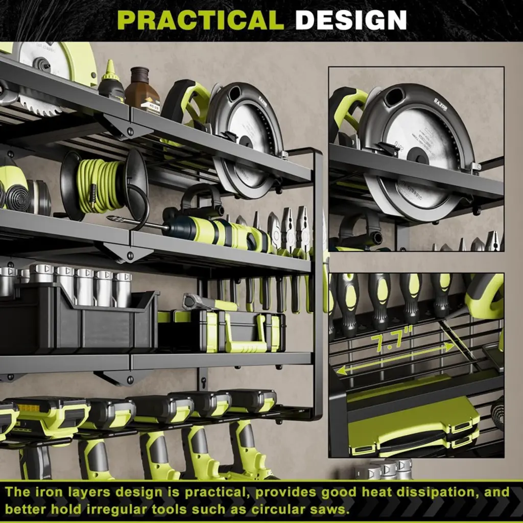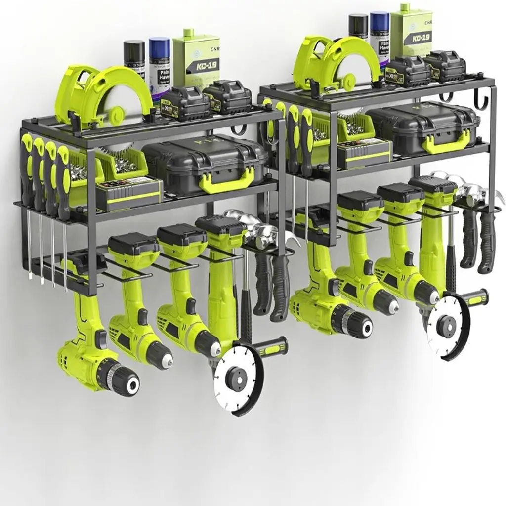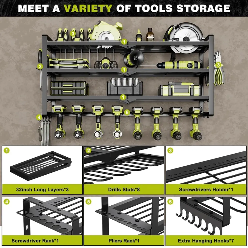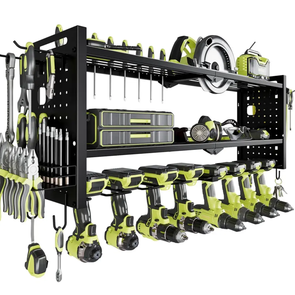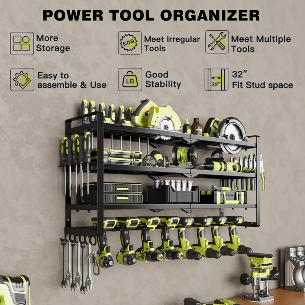 The Hausource 4-Layer Power Tool Organizer offers a smart solution for tool storage in garages, workshops, or sheds. With eight drill holders, spacious shelves, and multiple hooks, it keeps your tools neat, visible, and easy to access. The heavy-duty design fits securely on most walls and supports high weight loads. Quick to install and built to last, it's also a perfect gift for husbands, dads, or DIY lovers who value a clean, efficient workspace.