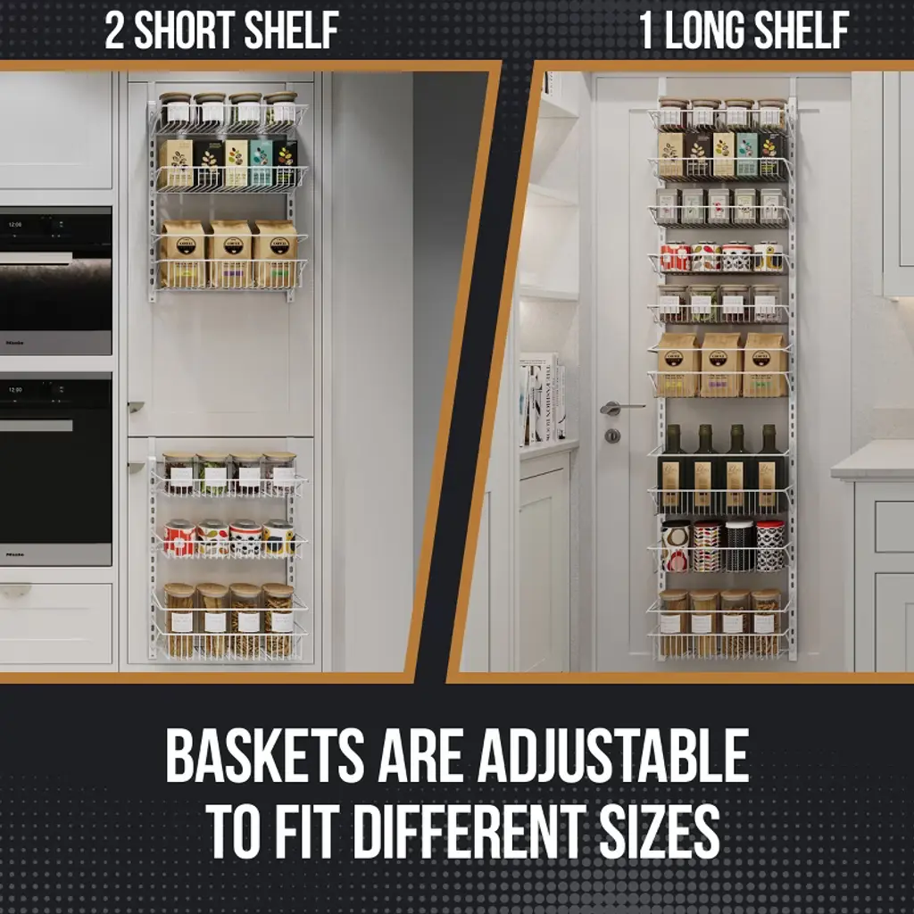 The Storage Shelves by Home-Complete are a space-saving essential for your kitchen, pantry, or closet. This pantry door organizer features 9 shelves that are conveniently adjustable and can be moved as needed, as well as 3 metal bar stoppers to prevent taller items from falling out. The storage rack features durable shelves for storage that are perfect for storing spices, jars, cleaning products, cereal boxes, soda bottles, and so much more.