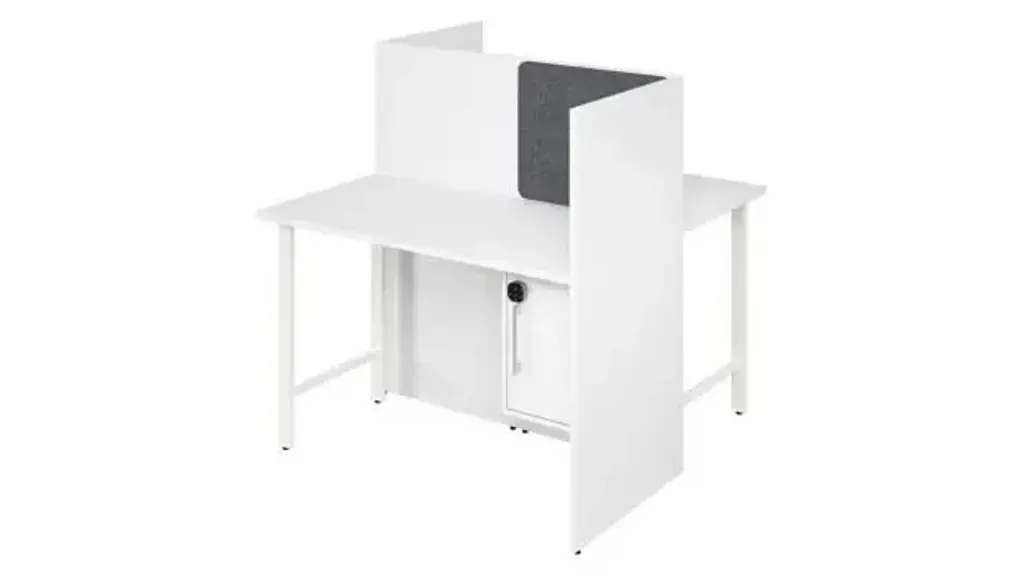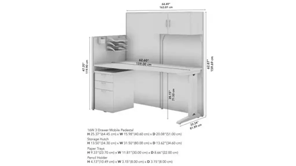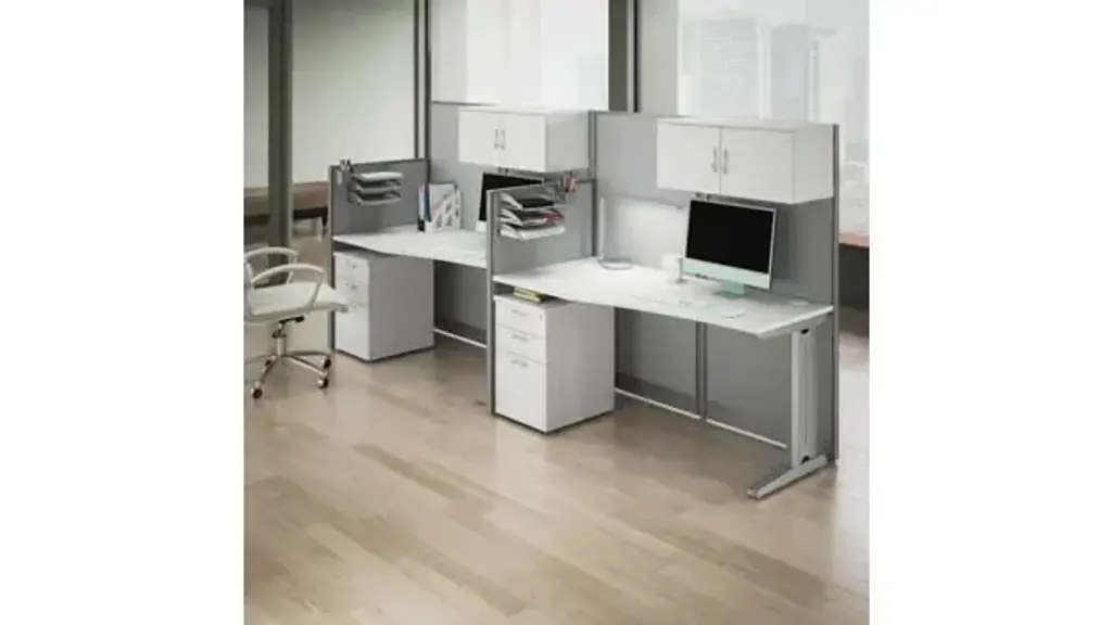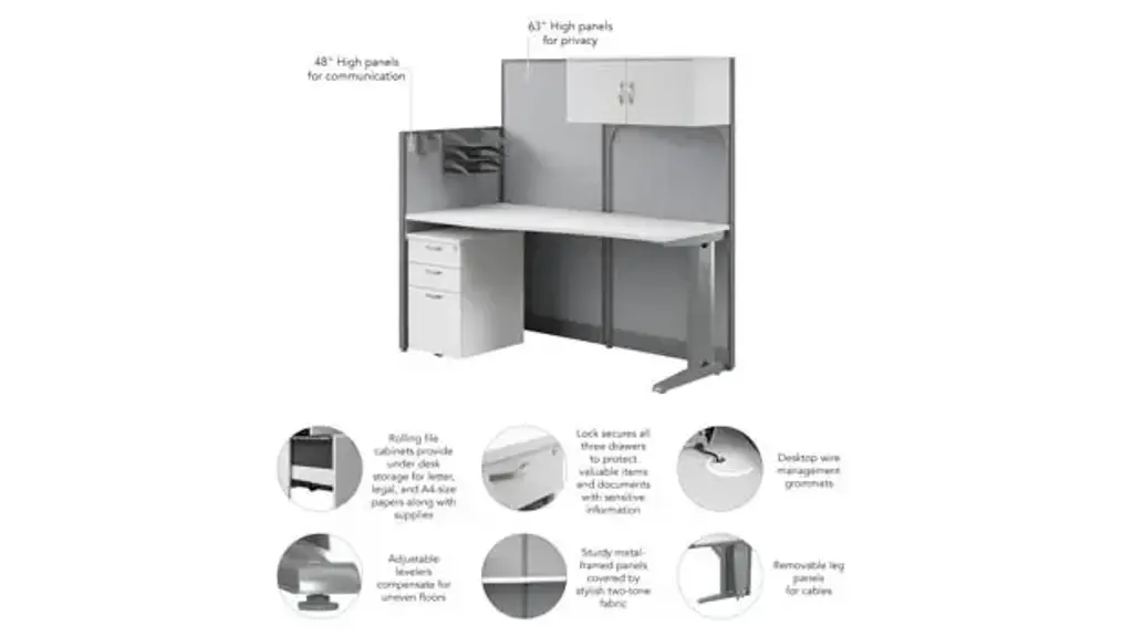Create an efficient, organized workspace in a matter of minutes with the Bush Business Furniture Office in an Hour 65"W x 33"D Cubicle Workstation with Storage. The office desk combines a thermally fused laminate surface with sturdy steel legs to resist scratches, stains and damage. In addition to the desk, the workstation includes one 48"H and two 63"H cubicle panels, along with all necessary hardware. These metal-framed panels are covered by stylish two-tone fabric. The desk and cubicle panels include adjustable levelers to compensate for uneven floors. A convenient cable management system features desktop grommets and removable panels in the metal legs for organizing cords. Keep your supplies and documents in order with the included Storage Cabinet, Adjustable Paper Tray, Pencil Cup and Mobile File Cabinet. The assembled Storage Cabinet mounts to a 63"H Panel and includes necessary hardware. The Mobile File Cabinet drawers open on full-extension ball bearing slides for a smooth and easy reach to the back. Two box drawers work great for personal items, pens and paper, while a file drawer holds letter and legal-sized folders. The Paper Tray and Pencil Cup mount to the 48"H Panel to further organize your work surface. Turn open spaces into efficient offices with this easy-to-assemble workstation. Meets ANSI/BIFMA standards for safety and performance. Made in USA. Ships ready for easy assembly.