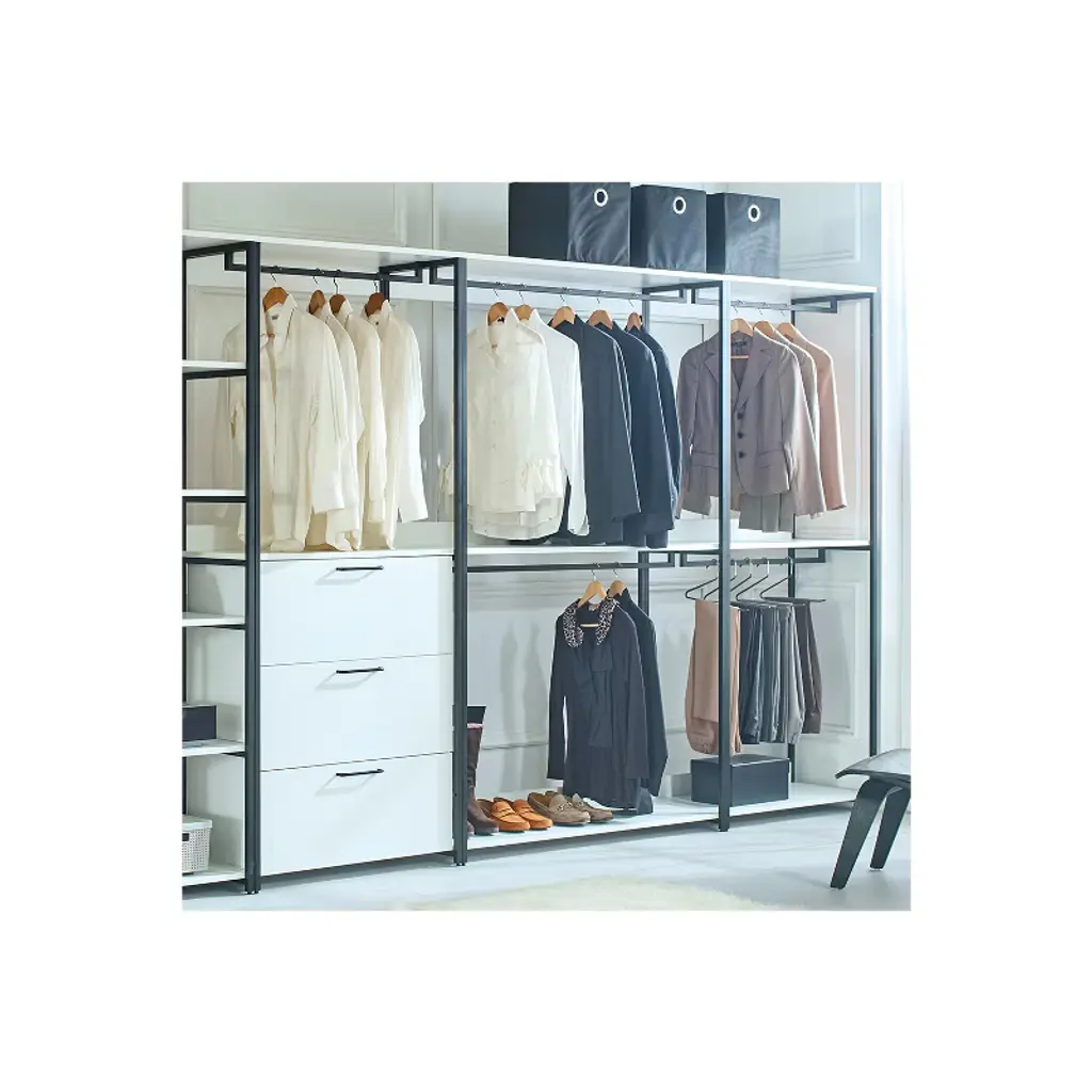 Organize your space with the HomeStock Fiona Walk In Closet Organizer, a freestanding solution designed for maximum versatility. This closet system features four tower units, providing ample storage for all your clothing and accessories. Constructed with durable materials and a stylish two-tone design, the Fiona Collection combines a classic white wood appearance with a sleek black metal frame. The modular construction allows for custom configuration, ensuring efficient use of space and accommodating a variety of storage needs. Soft-closing drawers add a touch of convenience and safety, while the overall design enhances both functionality and aesthetic appeal.