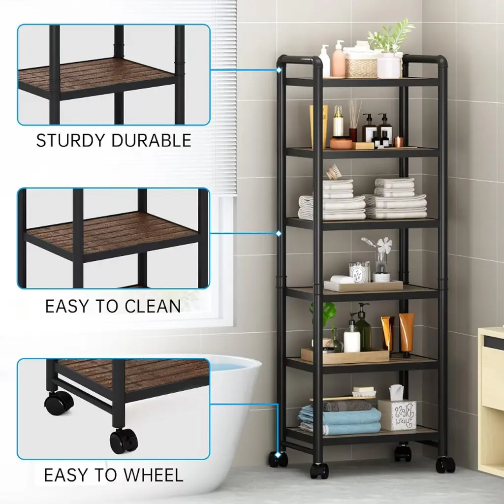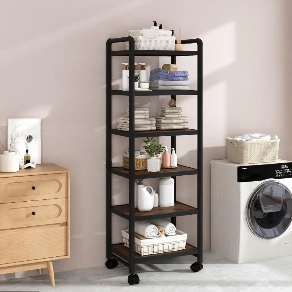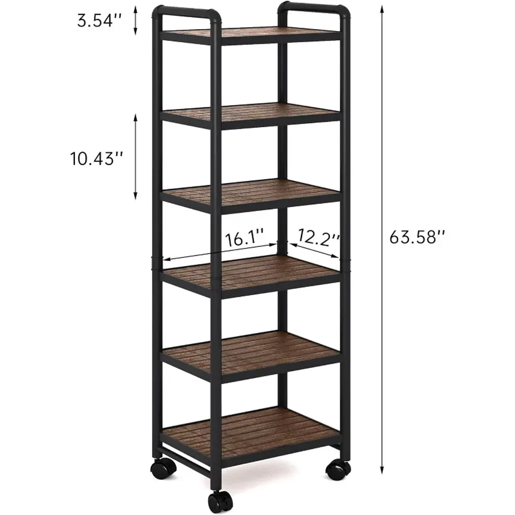 6-Tier Narrow Rolling Shelves: Industrial Style & Versatility Maximize storage with these sleek industrial shelves, featuring a black galvanized pipe frame and rustic brown wood slats. The 6-tier design (16.14''L x 12.2''W x 63.5''H) offers vertical space-saving storage, easily split into smaller units for flexible use in kitchens, bathrooms, garages, or balconies. Sturdy resin slats and galvanized steel tubing (with rust-resistant coating) ensure industrial-grade durability, supporting heavy items with confidence. Four 360° lockable wheels allow smooth mobility or stable positioning, while the compact footprint fits tight spaces. Ideal for indoor/outdoor use, this versatile rack combines style and functionality—perfect for organizing tools, plants, or household essentials. Easy to assemble without complex tools, it’s a practical addition to any space. Upgrade your organization—order these rolling shelves today!