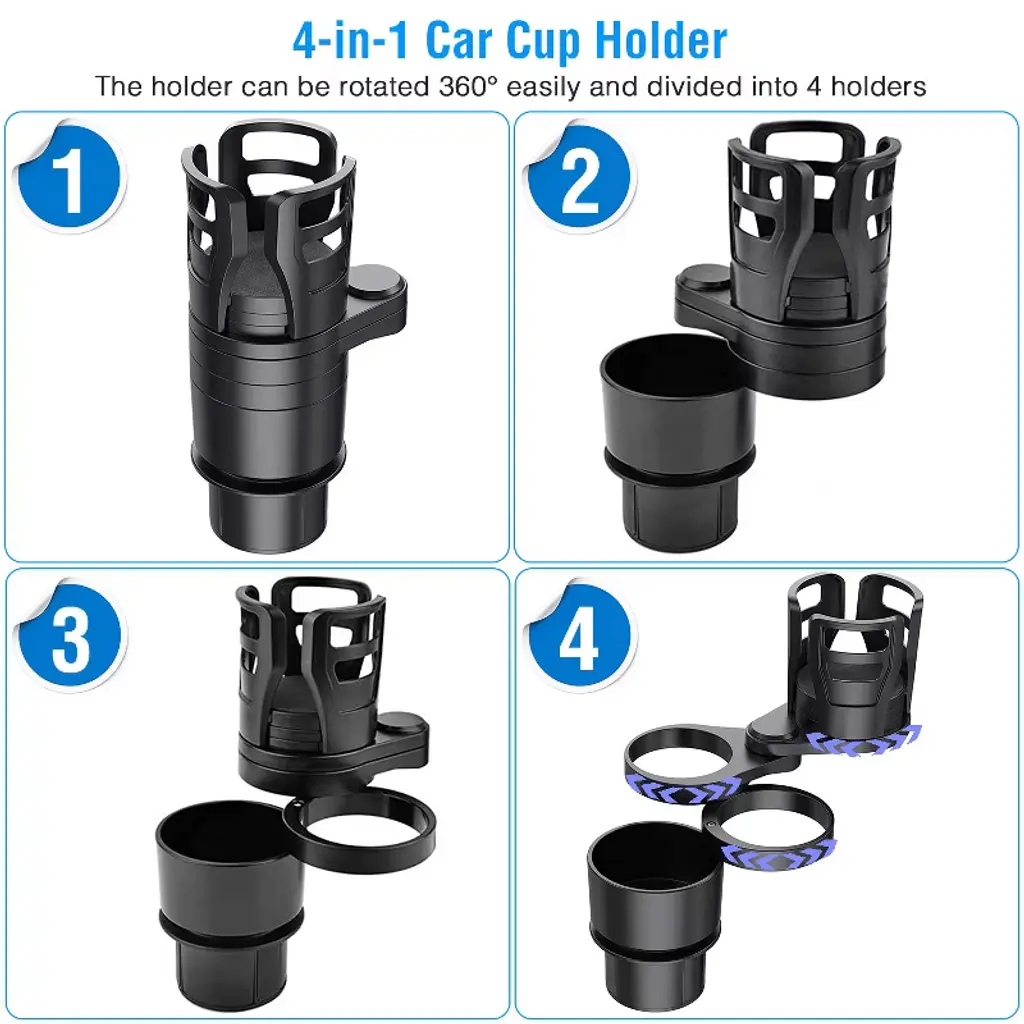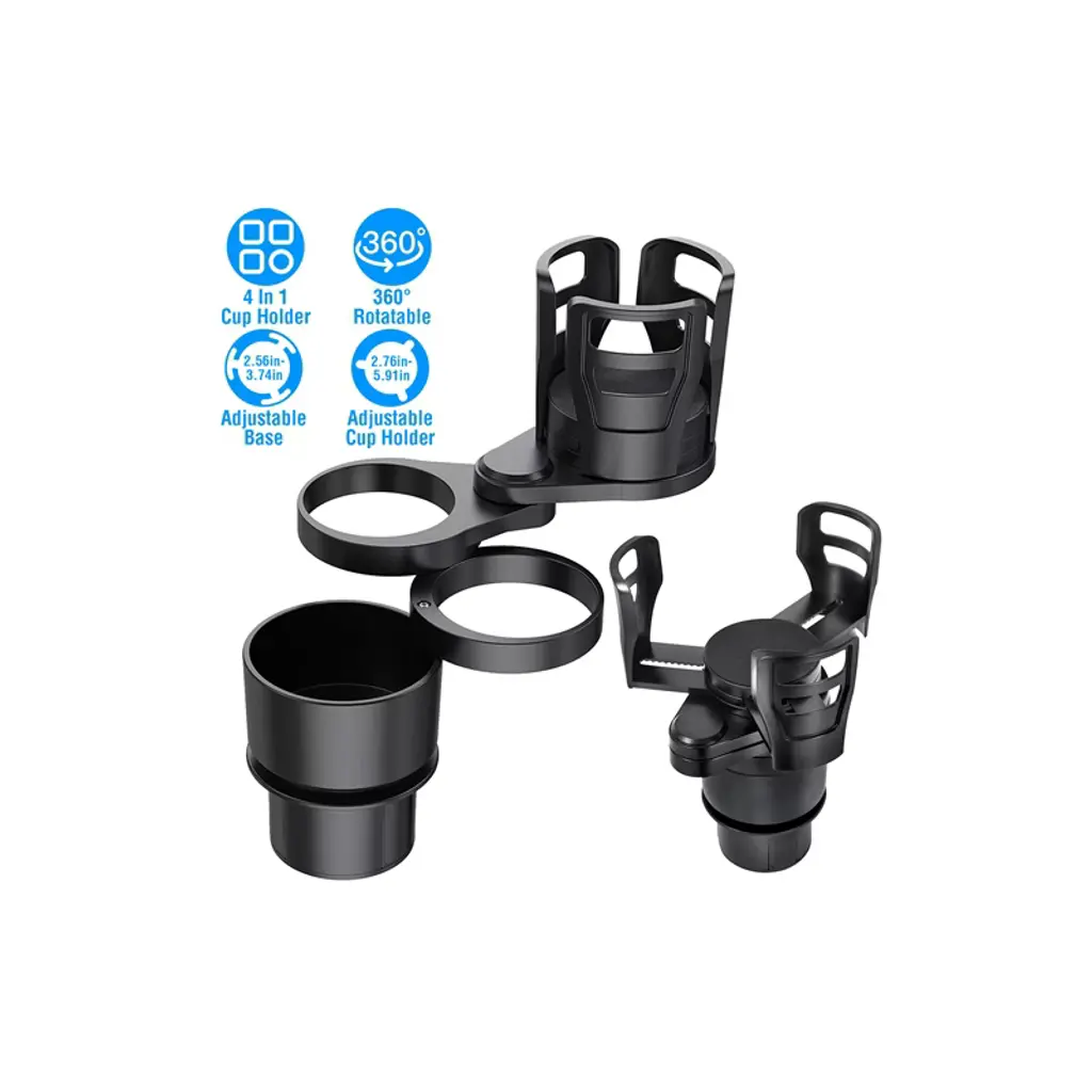 4-in-1 Car Cup Holder: This versatile car cup holder features a 360° rotating design, allowing it to be divided into four separate holders. The top holder is adjustable, expanding from 2.76 inches to 5.91 inches in diameter to accommodate cups, bottles, and even bowls. Two hook-style holders are perfect for conical bottles or cups up to 2.76 inches in diameter. The bottom holder is ideal for storing small items like keys, coins, bills, and more. Extra Storage Space: This cup holder expander maximizes your car’s cup holder space without taking up extra room. It’s perfect for holding drinks, snacks, mobile phones, electronics, and even fast food like fries and burgers, making it a great addition to any vehicle. Stable & Anti-Scratch Design: Equipped with sponge pads on the bottom of the top holder, the base, and silicone mats on the sides, this cup holder is designed to keep your beverages stable, preventing spills while driving. The anti-scratch materials also ensure it won’t damage your car interior. Premium Quality Materials: Made from durable ABS plastic, this car cup holder is heat-resistant and built to last, offering long-term use without wear and tear. Easy Installation: Simply adjust the base to fit your car’s cup holder (diameter range: 2.56in to 3.74in) and insert it for quick, hassle-free setup. This holder is compatible with most vehicles. Note: Avoid placing tall cups or bottles. Specifications: Brand: iMounTEK Product Type: 4-in-1 Car Cup Holder Color: Black Material: ABS Plastic Cup Hook Diameter: 2.56in (6.5cm) & 2.76in (7cm) Bottom Cup Diameter: 3.07in (7.8cm) Adjustable Top Cup Holder Diameter: 2.76in – 5.91in (7cm – 15cm) Base Diameter: 2.56in – 3.74in (6.5cm – 9.5cm) Item Size: 8.66 x 4.72 x 3.35 inches (22 x 12 x 8.5cm) Item Weight: 0.8lbs (362g) Package Size: 8.86 x 4.53 x 3.35 inches (22.5 x 11.5 x 8.5cm) Package Weight: 0.97lbs (440g) Package Includes: 1 x 4-in-1 Car Cup Holder 1 x User Manual
