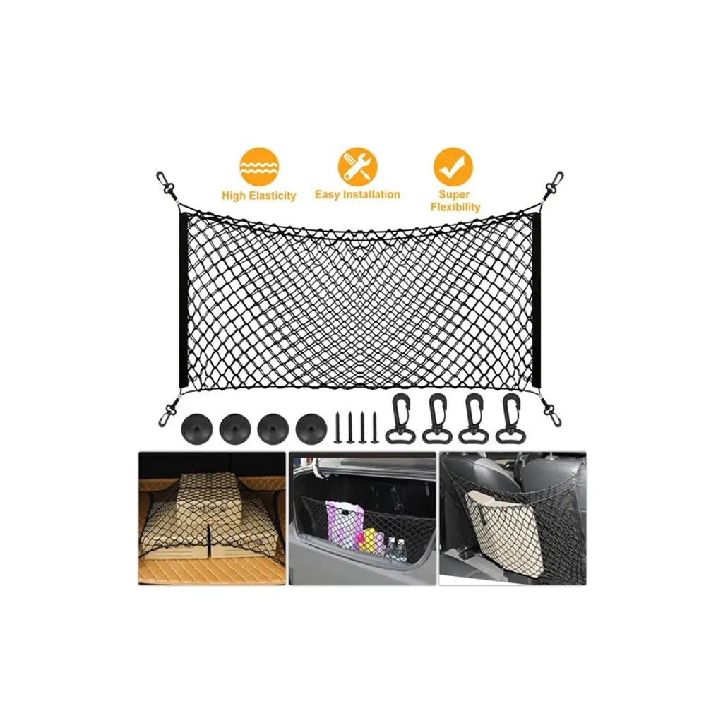 iMounTEK Universal Trunk Storage Net - Stretchable Cargo Organizer for Car, SUV, and Truck Keep your trunk or back seat neat and organized with the iMounTEK Trunk Storage Net. Measuring 39” x 15” (100cm x 40cm) and stretching up to 47” (120cm), this cargo net is designed to hold larger and bulkier items securely in place. Whether you’re storing kids' toys, sports equipment, or emergency kits, this net prevents items from rolling around, even during bumpy rides. Key Features: Large Coverage: Stretchable from 39” x 15” to 47” x 15” (100cm x 40cm to 120cm), accommodating larger items. Universal Fit: Perfect for car, SUV, truck, and van trunk storage, as well as back seat use. Designed for surfaces with fluff that can attach to the included buckle. Convenient & Practical: Keeps your items organized and prevents clutter from moving around during travel. Easy Installation: Installs quickly and securely using the included magic tape on fluff surfaces (not suitable for smooth surfaces). Premium Quality: Made from durable nylon and rubber material to withstand heavy use without tearing. Specifications: Brand: iMounTEK Color: Black Material: Nylon + Rubber Band Product Size: 39.4” x 15.7” (100cm x 40cm) Package Size: 6.69” x 5.91” x 1.57” (17cm x 15cm x 4cm) Product Weight: 0.32 lbs (146.5g) Package Weight: 0.51 lbs (233g) Package Includes: 1 x Trunk Storage Net 4 x Mounting Adapters 4 x Screws 4 x Hooks