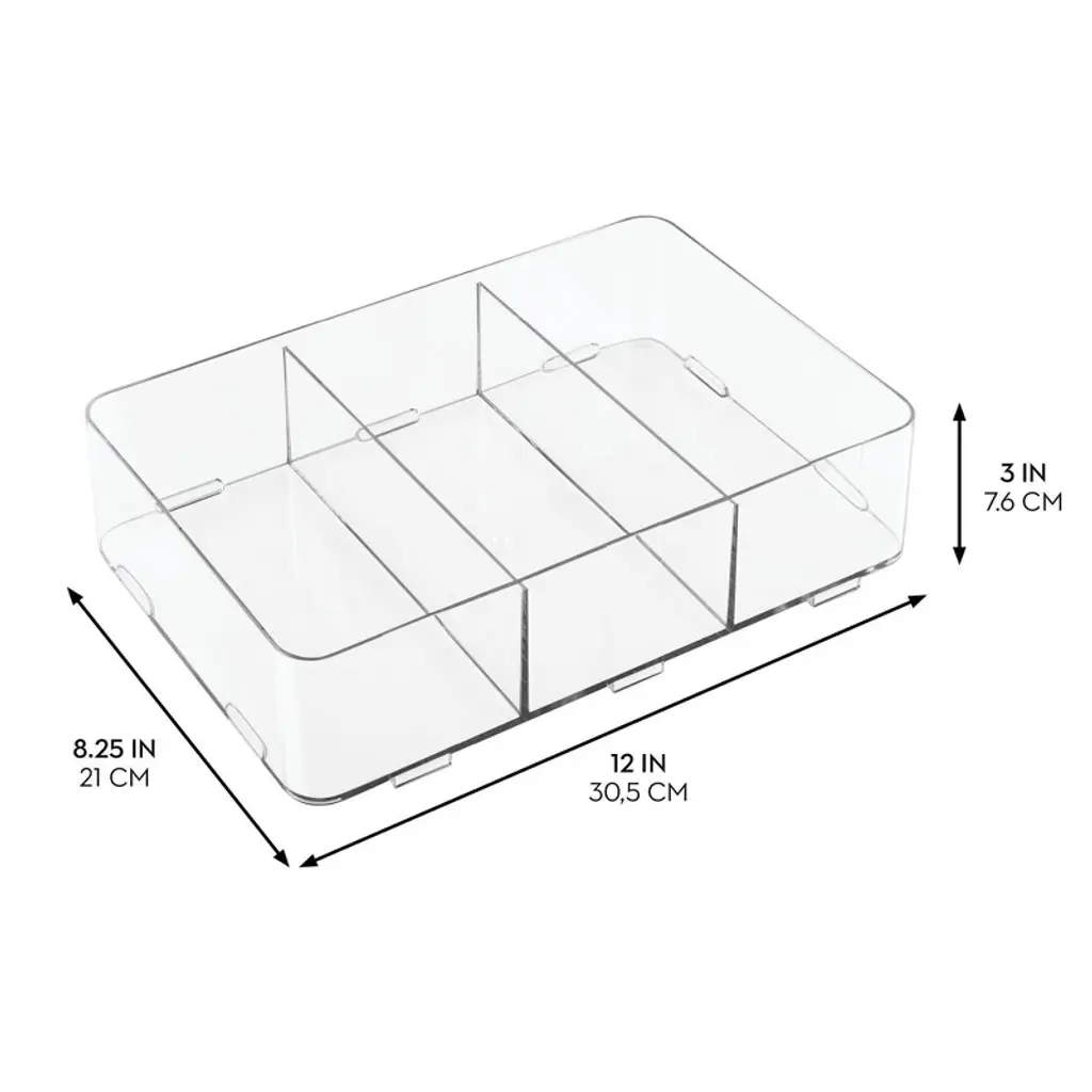 The iDesign Clarity Drawer Organizer features three perfectly sized compartments, making it easy to locate and retrieve your most frequented items while keeping drawers neat and organized. Interlocking sides enable you to connect multiple organizers, preventing units from sliding while maximizing drawer space. Its plastic construction ensures longevity, and its highly versatile design brings personalized organization to any drawer throughout your home while keeping your belongings visible and easily accessible.