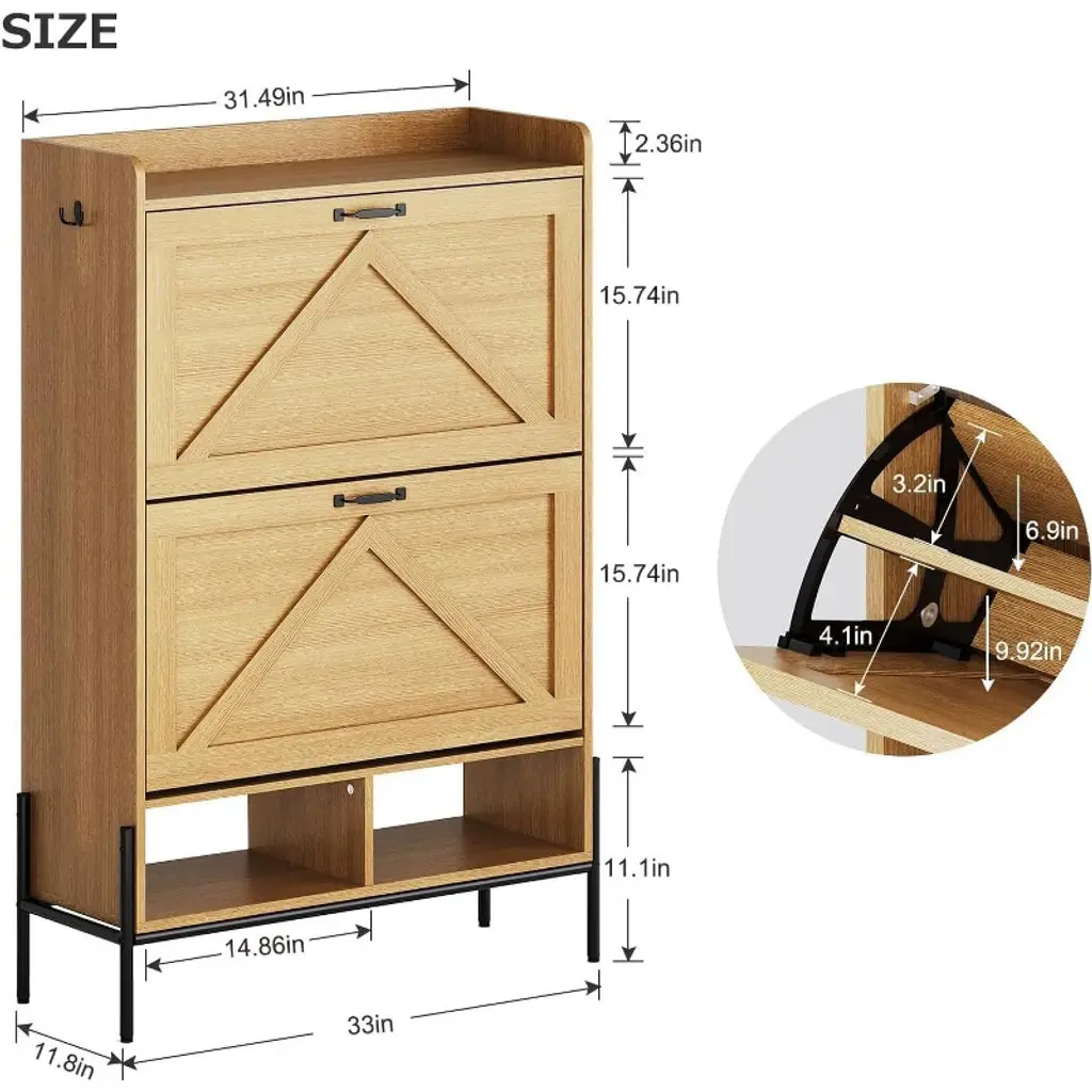 Description: This stylish wooden shoe cabinet features two space-saving flip drawers perfect for narrow entryways hallways living rooms or porches. Measuring 46.06 inches deep, 18.43 inches wide, and 7.4 inches high, it provides neat concealed storage that protects shoes from dust pets and insects. Crafted from engineered wood with sturdy metal feet, it offers strong load-bearing capacity and includes an anti-tip kit for enhanced safety. Detachable black hooks add extra convenience for hanging umbrellas or bags. Easy to assemble with clear instructions, this organizer keeps your space tidy and accessible. Dimensions: 46.06 inches D x 18.43 inches W x 7.4 inches H Material: Engineered wood (MDF), metal feet Shape: Rectangular Number of Drawers: 2 Item Weight: 68.98 pounds Mounting Type: Floor mount Special Feature: Adjustable feet, anti-tip device What You Get: 1 Wooden shoe storage cabinet with 2 flip drawers Anti-tip kit for wall mounting Two detachable accessory hooks Assembly hardware and instruction manual After-Sales Service: We provide detailed assembly guidance and responsive customer support to ensure smooth setup and address any concerns. Our team is committed to helping you organize your home efficiently with confidence.
