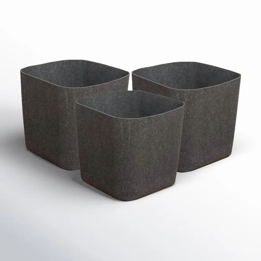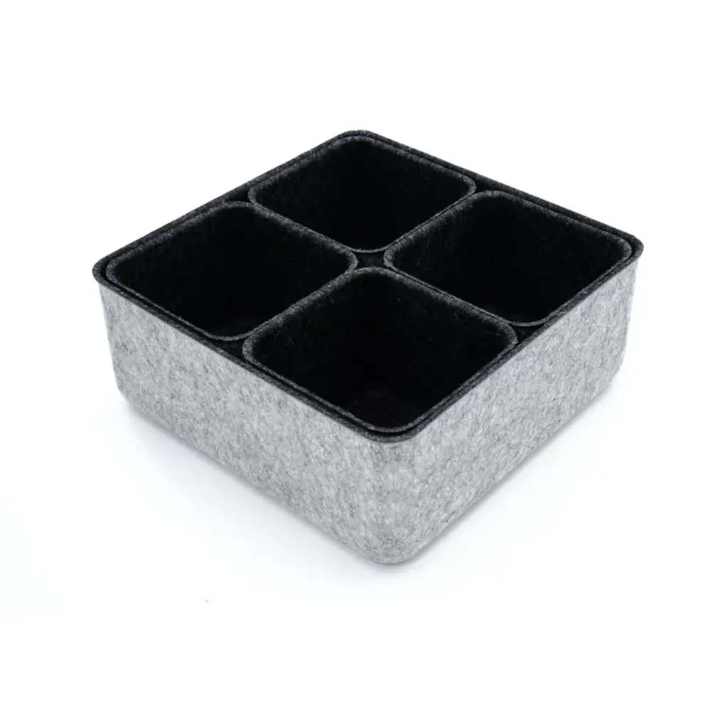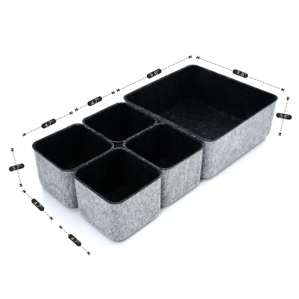 1.Made of recycled felt 2.Size : S-4.7 x 4.7 x 3.7", L-9.8 x 9.8 x 3.9 in 3. 2 tones bins, with small accessories, pen ,gift,Jewelry etc in the bin to fit in the drawer 4.organize each in clean and stylish lifestyle 5.mix and match for any drawer size and storage need. Perfect for home, office, desk use. no noisy like plastic, no slide when drawer pulled , anti slip of stuffs inside of bins, easy cleaning.