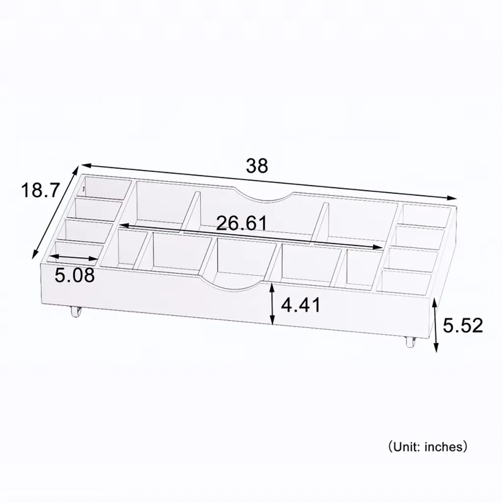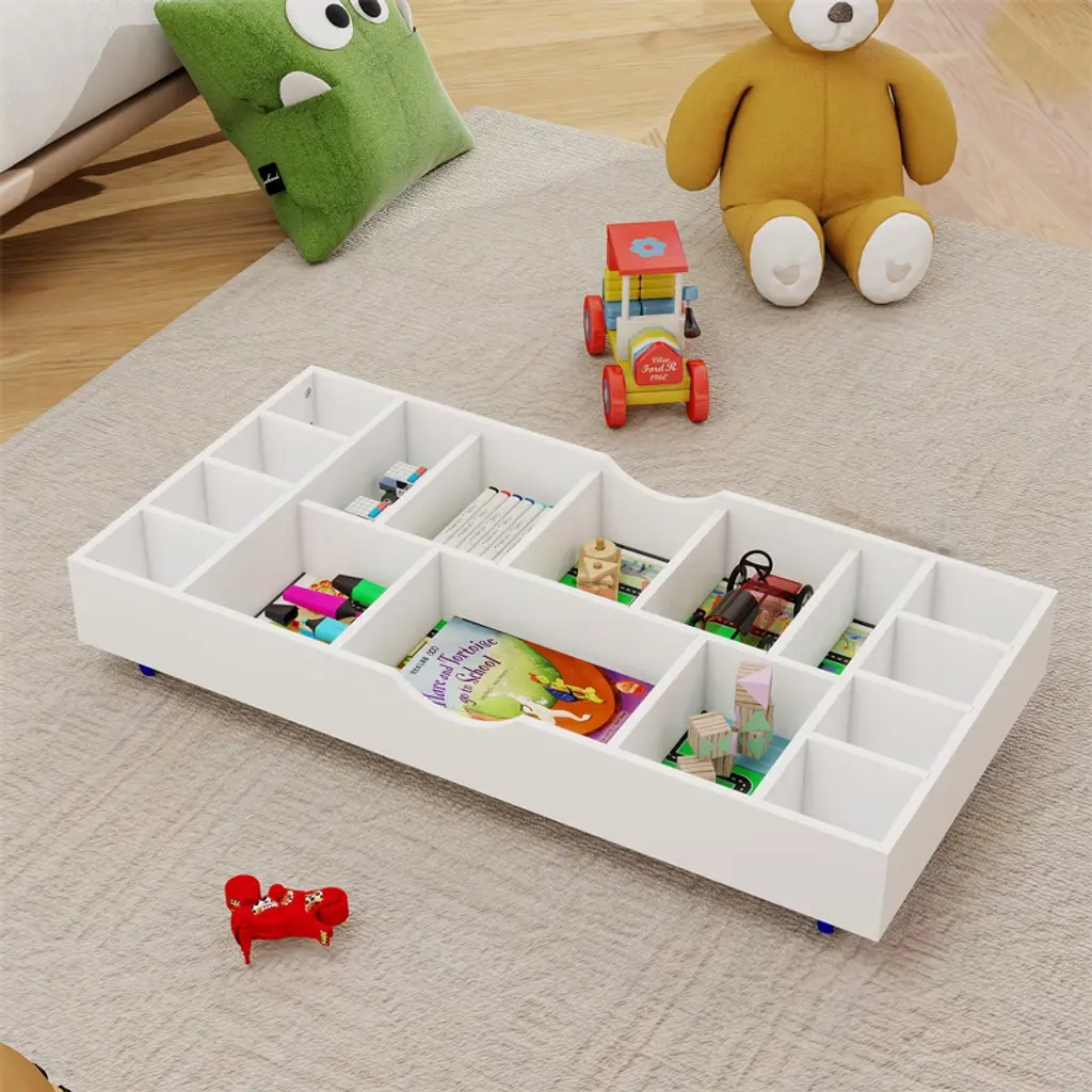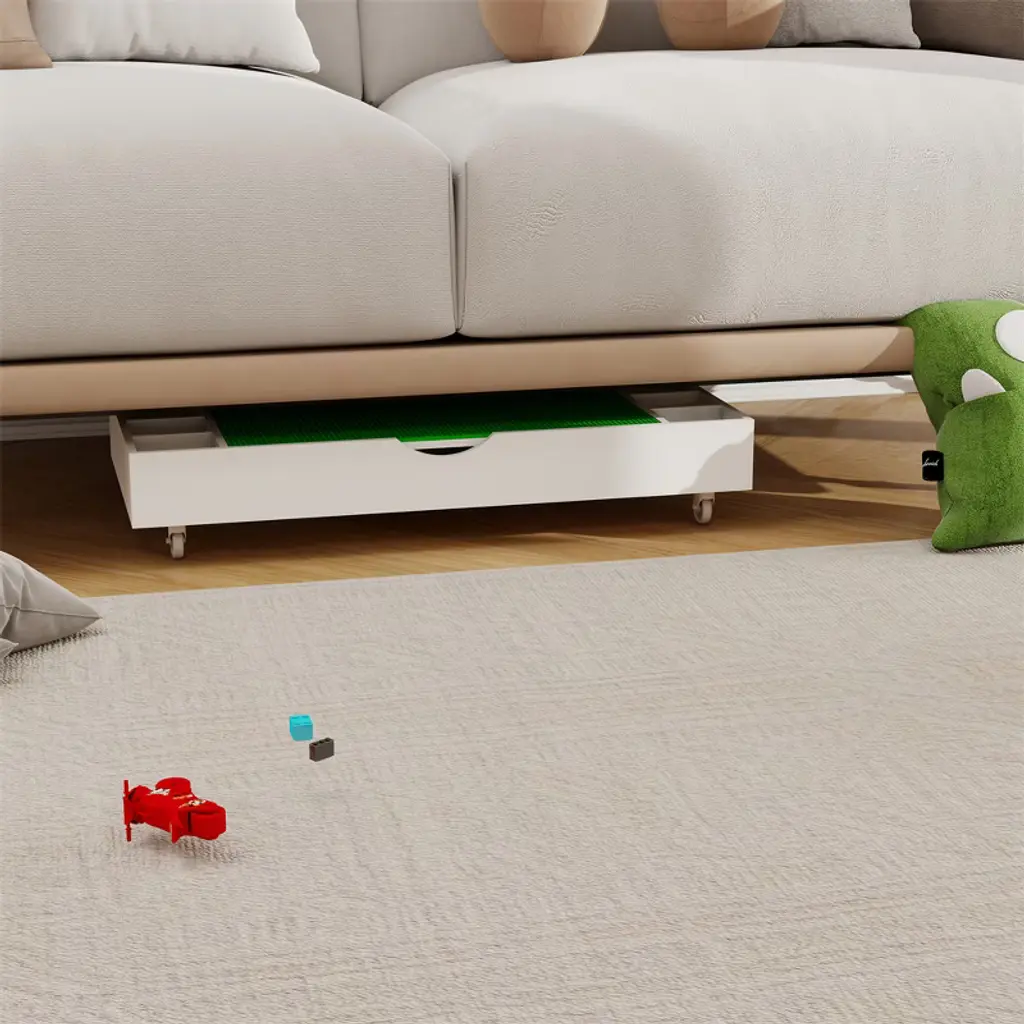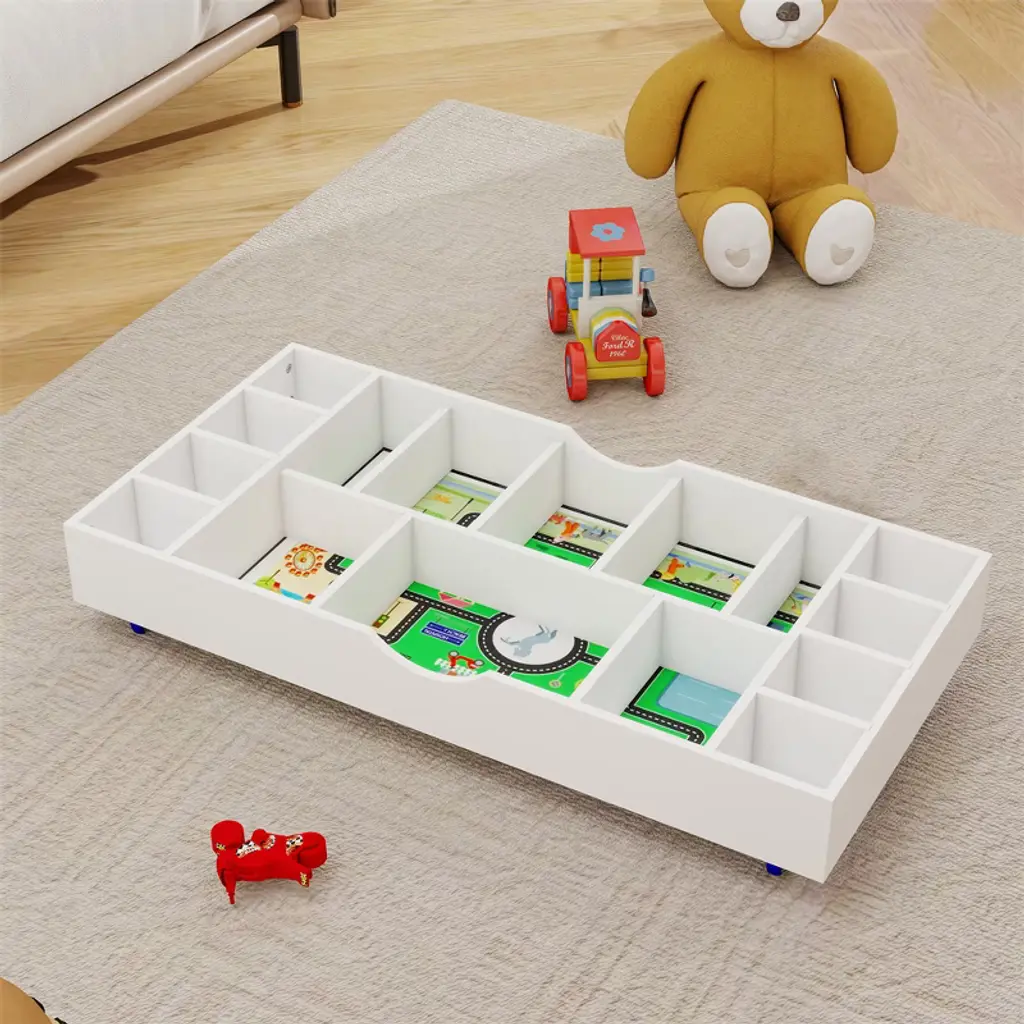 Product advantages: Multi functional 2-in-1 design: The top has a brick base that is compatible with LEGO, allowing children to play building games. On the other side of the desktop is a smooth whiteboard used for making art and crafts. Detachable partition: Equipped with 12 detachable partitions (except for the long partition in the middle), it has ample storage compartments that can be easily rearranged to accommodate toys, crafts, etc., making your living space clutter free. Simple and convenient design: This rolling game table is designed to be easy to roll and store under the bed or sofa. Equipped with notches for easy lifting of wooden boards. In addition, if the available space is limited, the wheels can be easily disassembled.
