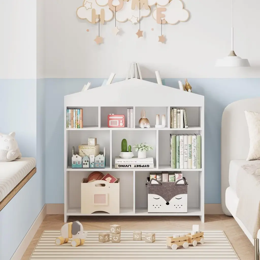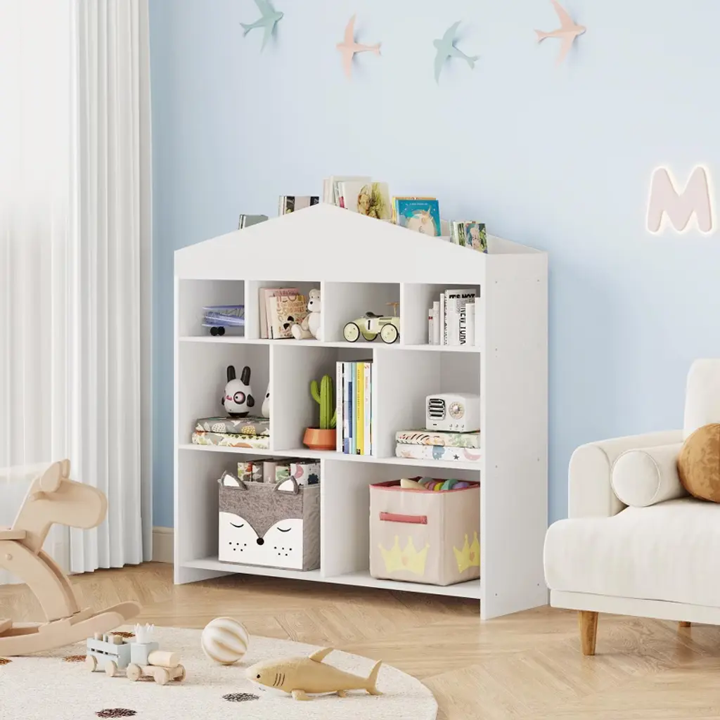 Kids Bookshelf With 9 Storage Cubbies Dollhouse Bookcase Toy Storage Organizer Toddlers Playhouse Wooden Bookshelf