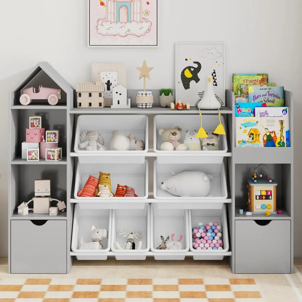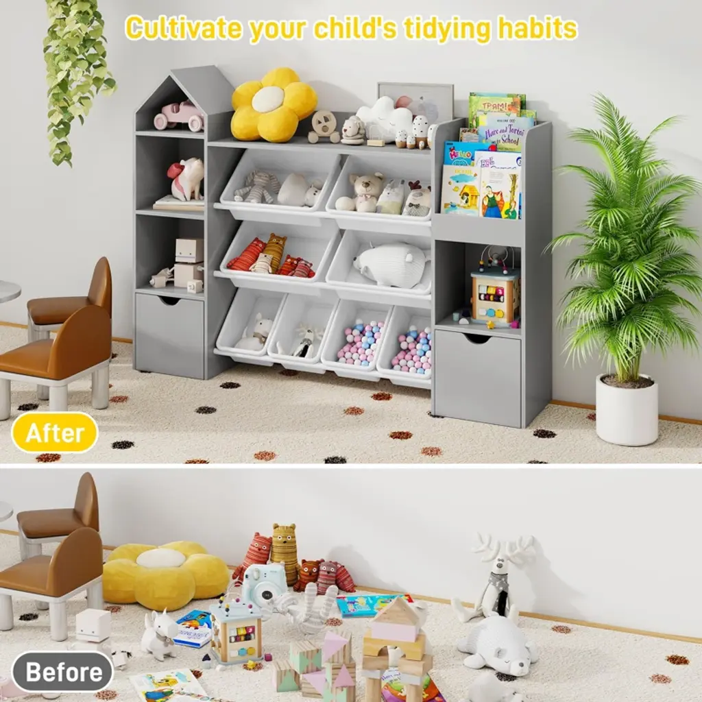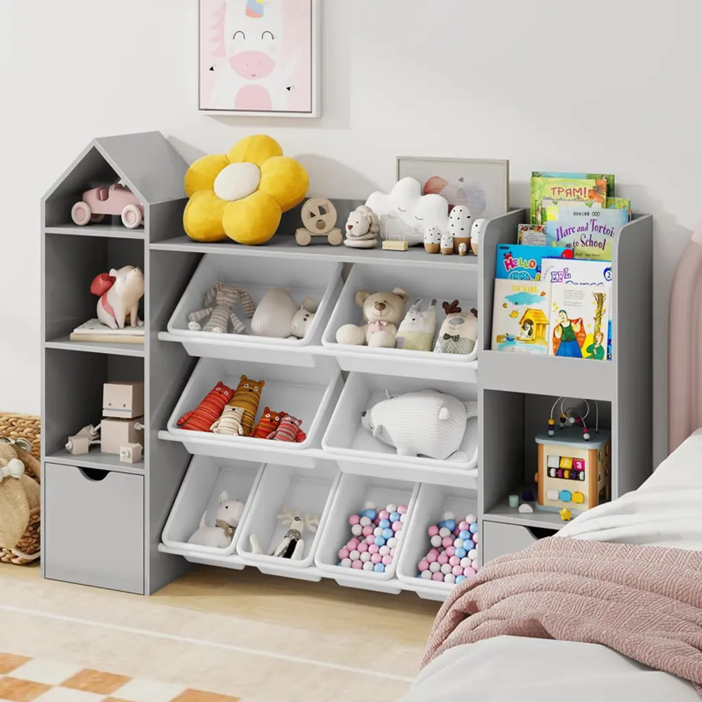 Kids Toy Organizer With Removable Toy Bins & Storage Cubbies, Kids Bookshelf, Grey