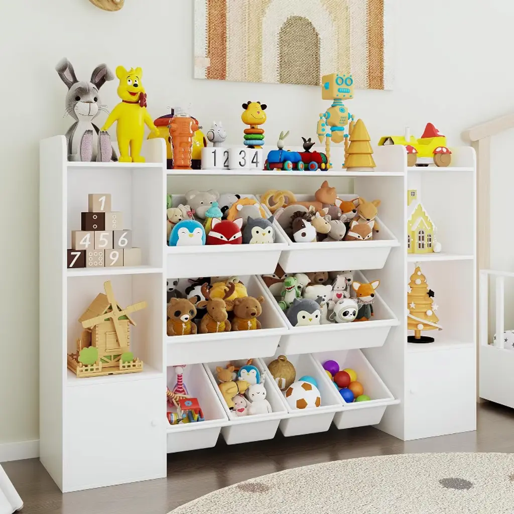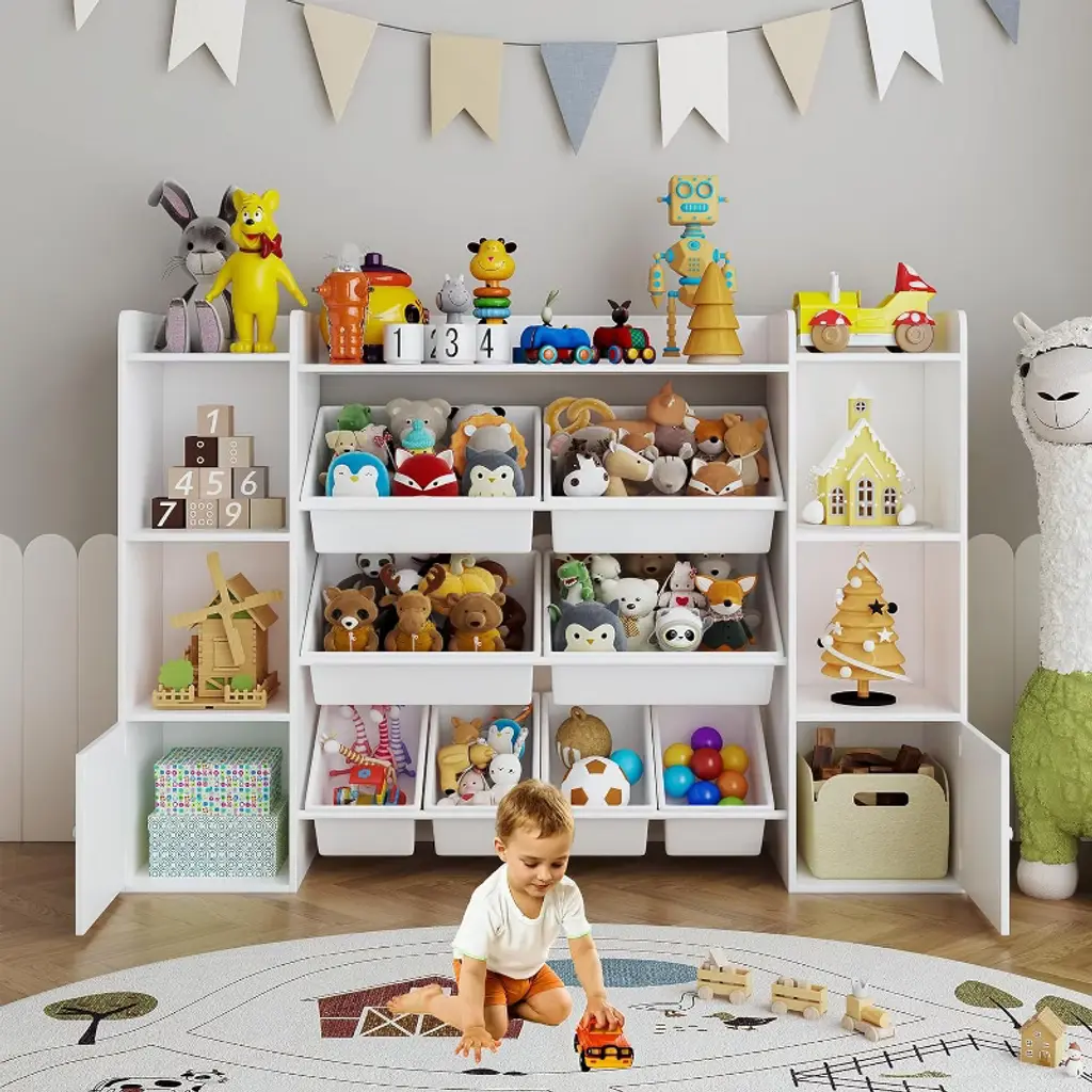Transform clutter into order with our 54.7" Kids Toy Storage Organizer—the ultimate solution for playrooms, classrooms, and bedrooms. Engineered for safety and functionality, this 3-in-1 unit features 8 removable plastic bins (4 large + 4 small) for sorting toys, 3 open shelves for books/display, and 2 floor-level cubbies with doors to hide bulky items. The anti-tip wall anchors provide certified safety (AS-TM F2057), while rounded corners protect active toddlers.Crafted from CARB Phase 2-compliant engineered wood and non-toxic plastic bins, it’s available in four versatile colors: Pure White, Natural Wood, White + Primary-Colored Bins (Red/Yellow/Blue), or White + Pastel Bins (Yellow/Blue/Green). The minimalist design (54.7"W x 11.8"D x 35.4"H) maximizes vertical storage without overwhelming small spaces.Key Attributes:Materials: P2 engineered wood, BPA-free plastic binsDimensions: 54.7"W x 11.8"D x 35.4"HWeight Capacity: 30 lbs/shelf | 15 lbs/binCare: Wipe with damp cloth; avoid abrasive cleanersUse: Bedrooms, nurseries, daycares, homeschool spacesEncourage independence—children can easily access toys while learning organization!