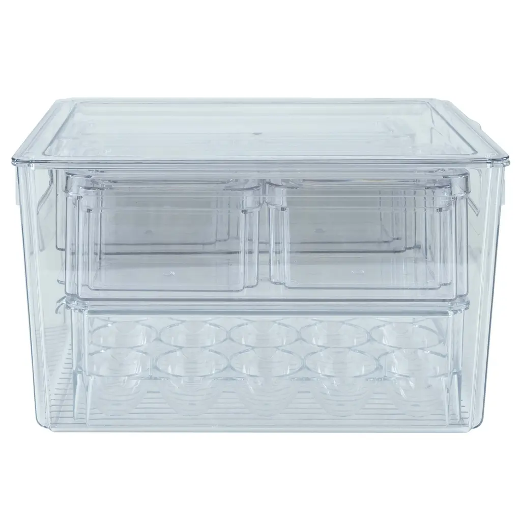 Revolutionize your refrigerator organization with our set of 8 clear organizers. This comprehensive set includes (4) Small, (2) Medium, (1) Large organizers, and (1) dedicated Egg Tray capable of holding up to 15 eggs. Crafted with functionality in mind, these organizers are not only refrigerator-safe but also BPA-free, ensuring a healthy storage solution. The stackable design maximizes space efficiency, while the elevated drain trays prevent condensation, keeping your fruits and vegetables fresh for longer. Versatile in use, these organizers can seamlessly transition from the refrigerator to pantries or cabinets, providing a streamlined and organized storage solution for your kitchen essentials. Elevate your kitchen experience with this set designed for convenience and practicality.