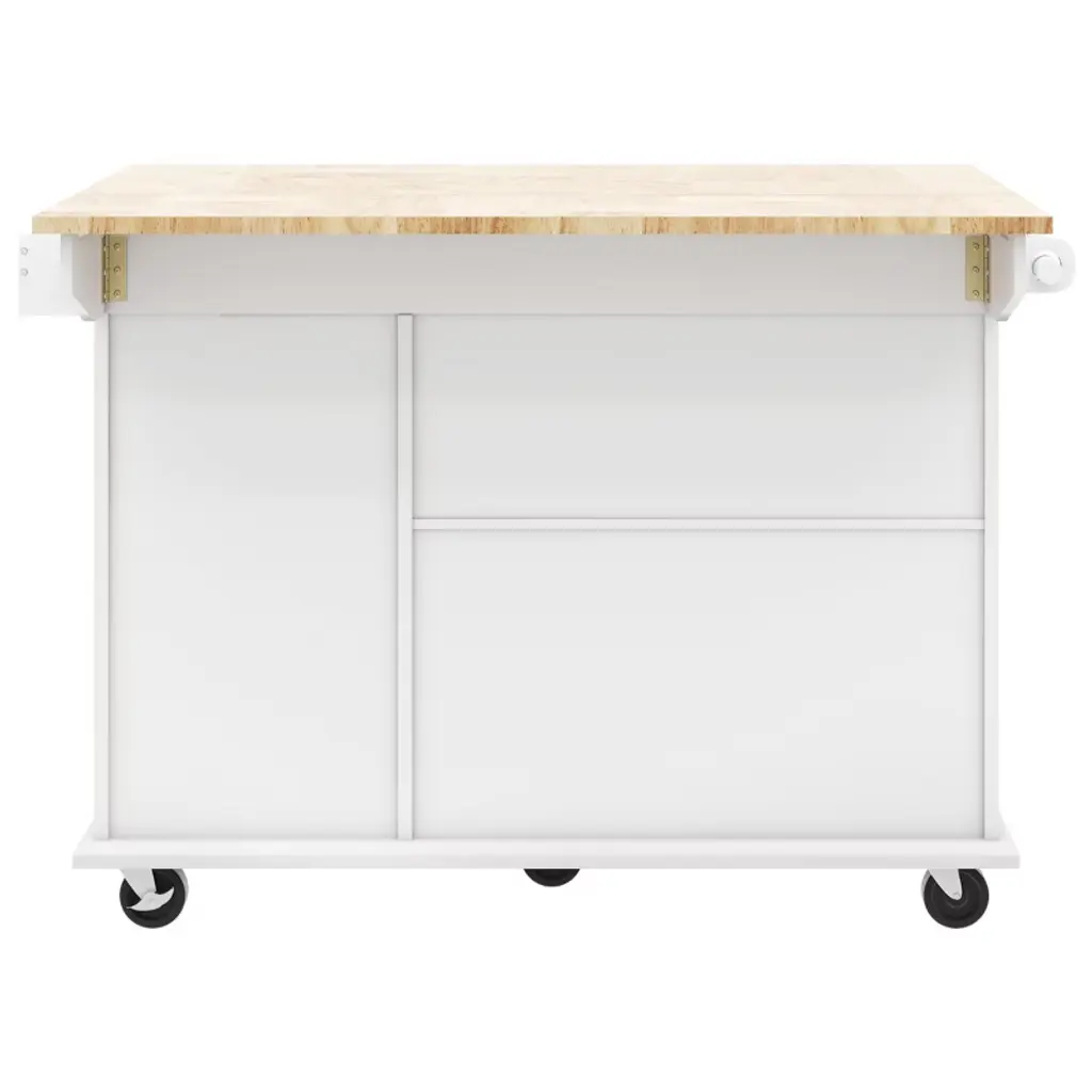 3-tier Pull-Out Cabinet Organizer Our kitchen storage cart is equipped with a convenient 3-tier pull-out storage organizer. Its sleek L-shaped design, featuring a narrow top and wider second and bottom drawers, effectively solves your storage problems while maximizing the limited space. Drop Leaf It features a spacious tabletop, making the island ideal for meal preparation or as a dining table providing an efficient space-saving solution. The countertop and leaf are reinforced with sturdy metal support frames, ensuring enhanced durability and stability. Mobile&Stationary The kitchen island is equipped with five smooth-rolling wheels, allowing for effortless mobility. Additionally, it features four sturdy solid wood cabinet feet and a central support plate. Internal Storage Racks This rolling kitchen island features an internal storage rack design inspired by the functionality of refrigerator doors. These racks effectively optimize storage capacity while occupying minimal space, making them an ideal addition to kitchens, dormitories, offices, bedrooms, and dining areas. Product Specifications Product Dimension(Overall) 53.94 x 28.74x 36.81 inches Product Weight 114.64LBS Tabletop Weight Capacity 220LBS Drop Leaf Weight Capacity 80LBS Product Care 1. Wipe with a soft dry cloth. Avoid the use of harsh chemicals and household cleaners as they may damage the finish. 2. Hardware may loosen over time; periodically check that all connections are tight. Estimated Time to Assemble 40-80 minutes