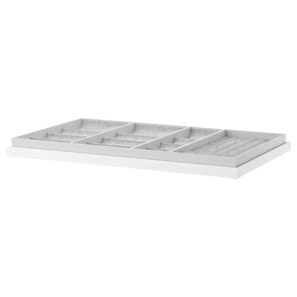 KOMPLEMENT Pull-out tray with insert - gray-beige/light gray 29 1/2x22 7/8 ". The insert helps you store and organize your sunglasses, watches and other accessories. Soft felt protects your accessories and keeps them neatly in place. You can easily see and reach your things since the tray pulls out.