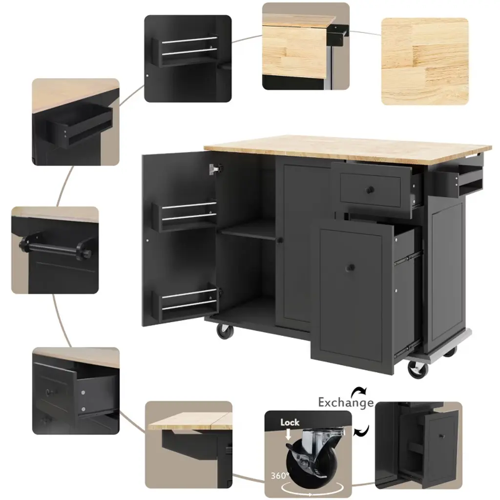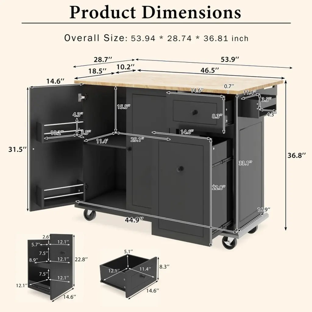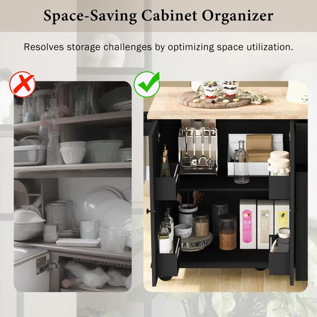 Ktmbdw Kitchen Island With Drop Leaf,53.9" Width Rolling Kitchen Cart On Wheels With Internal Storage Rack And 3 Tier Pull Out Cabinet Organizer,balck