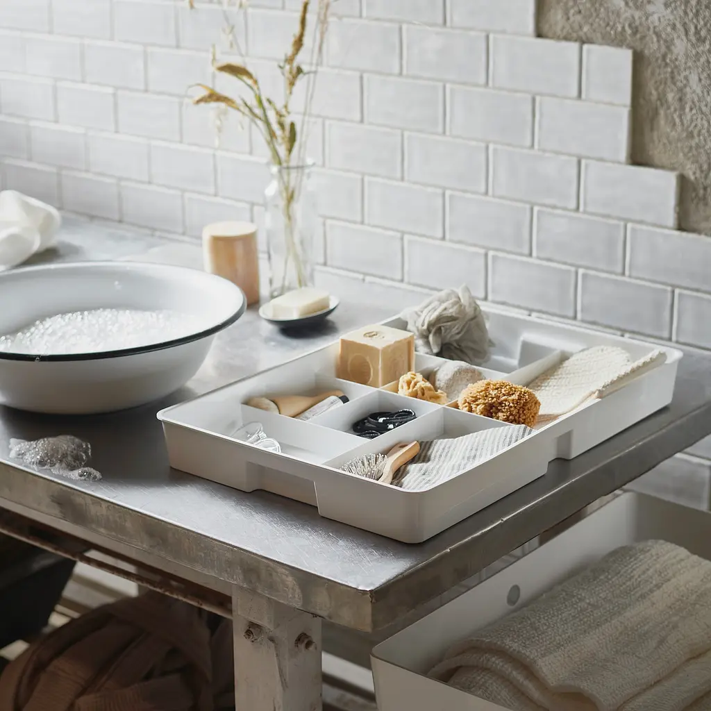 KUGGIS Insert with 8 compartments - white. The compartments gives you a good overview and helps you find what you need, when you need it. If you want to keep both smaller and larger items in the same box, combine the insert with KUGGIS box, 14½x21¼x8¼".