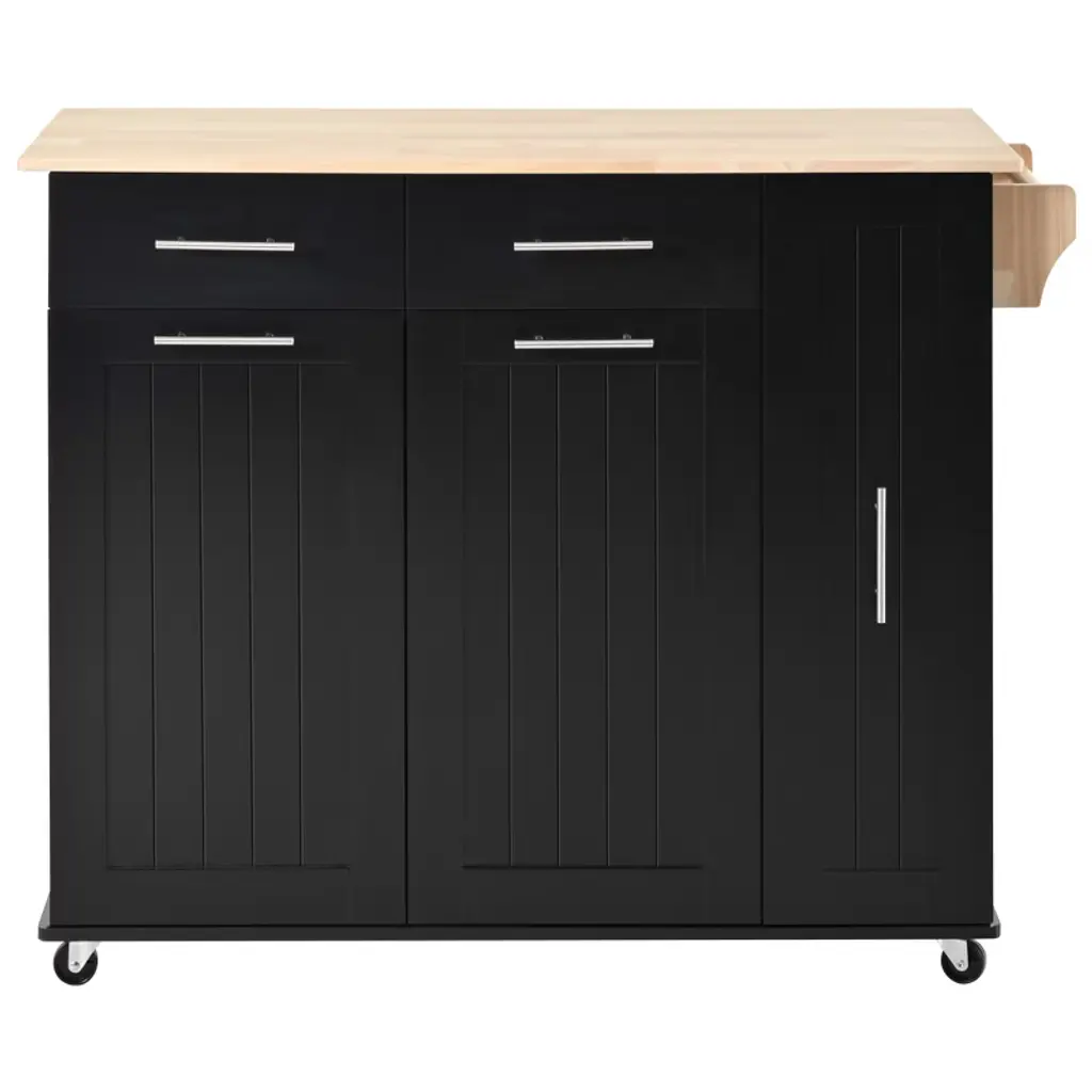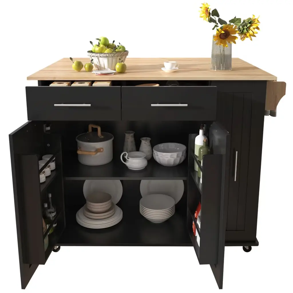 This versatile kitchen island offers ample storage space, effectively solving clutter and space shortages in kitchens and other indoor spaces. It features internal storage shelves and three pull-out cabinets. The pull-out cabinets feature an adjustable shelf at different heights to suit your storage needs. Furthermore, this kitchen island includes a folding board, two drawers, and a towel rack, adding even more convenience to your kitchen storage. It also features five freely movable wheels, two of which are lockable, ensuring mobility and stability.