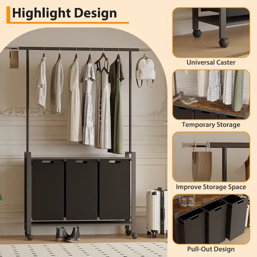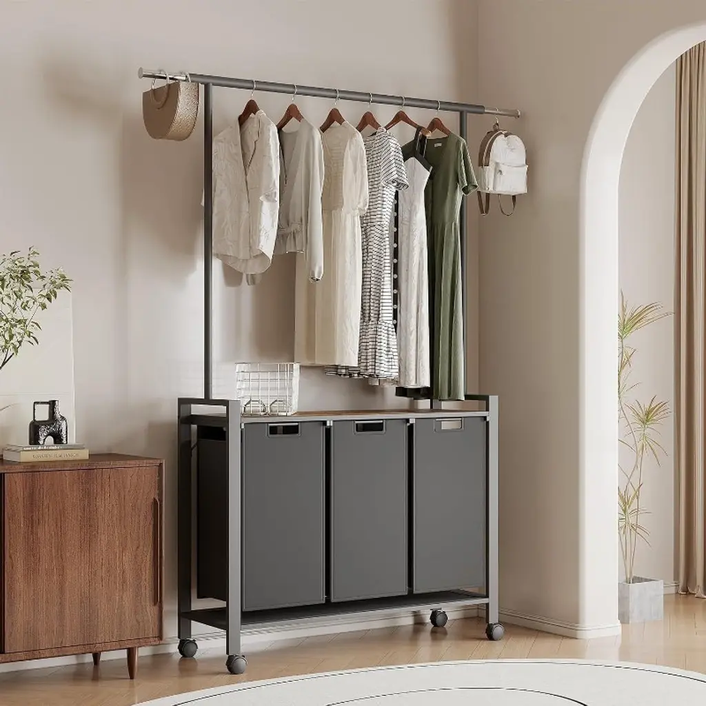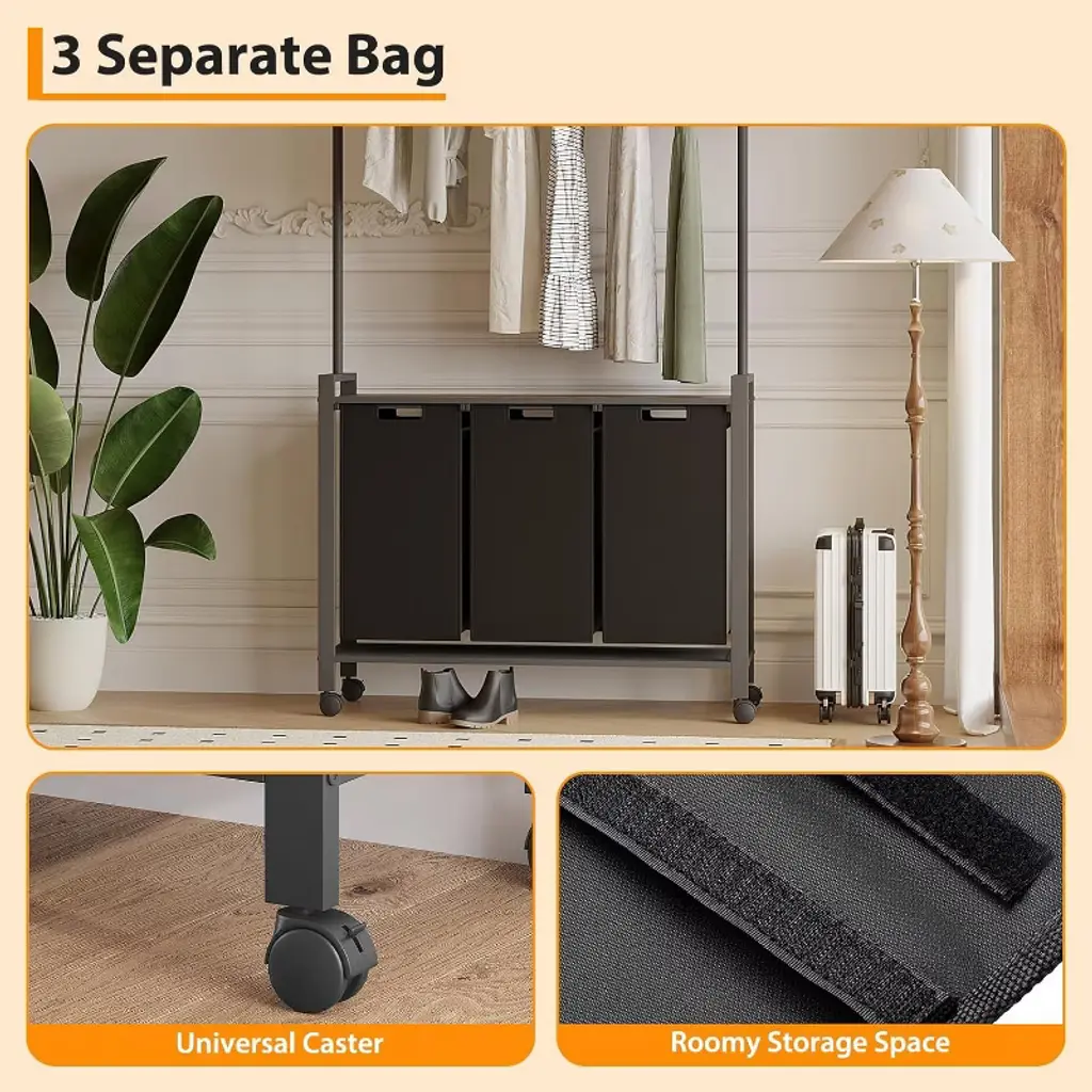 Laundry Sorter Cart With Hanging Rod, 3 Section Laundry Hamper With Wheels For Small Spaces, Laundry Organizer, Dirty Clothes Hamper