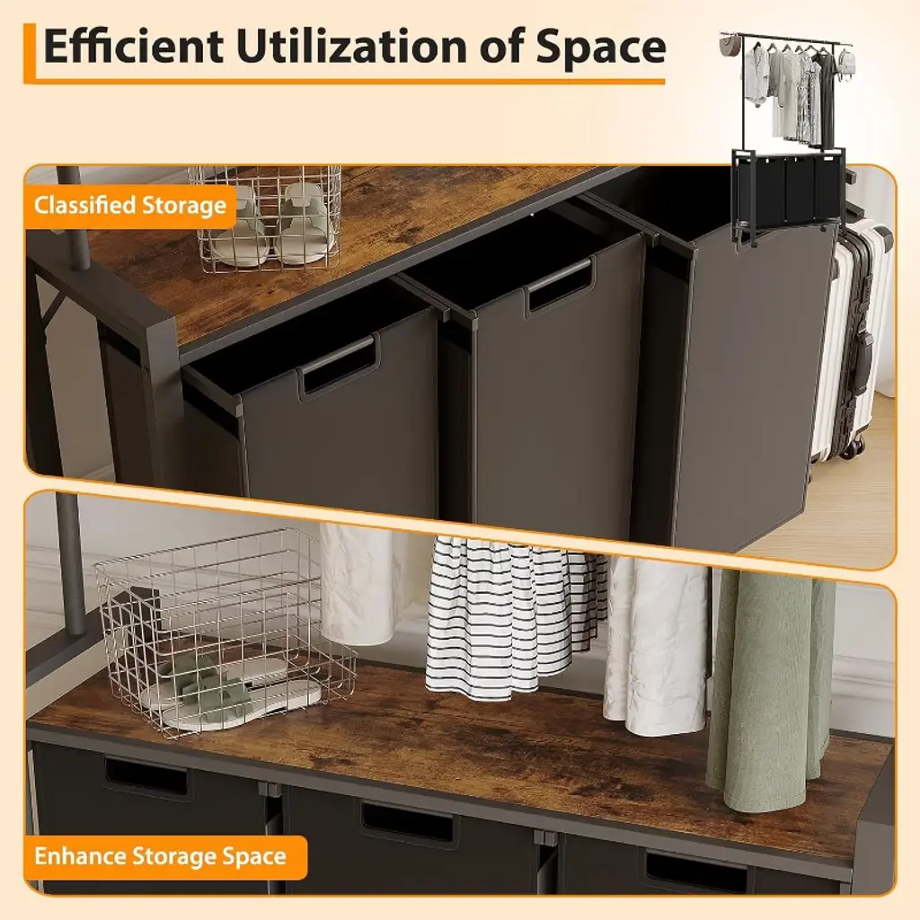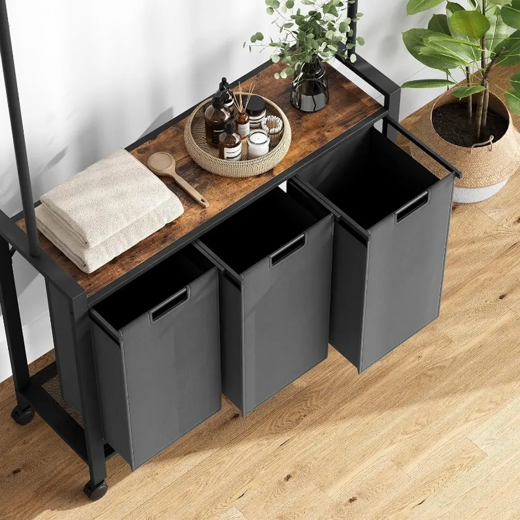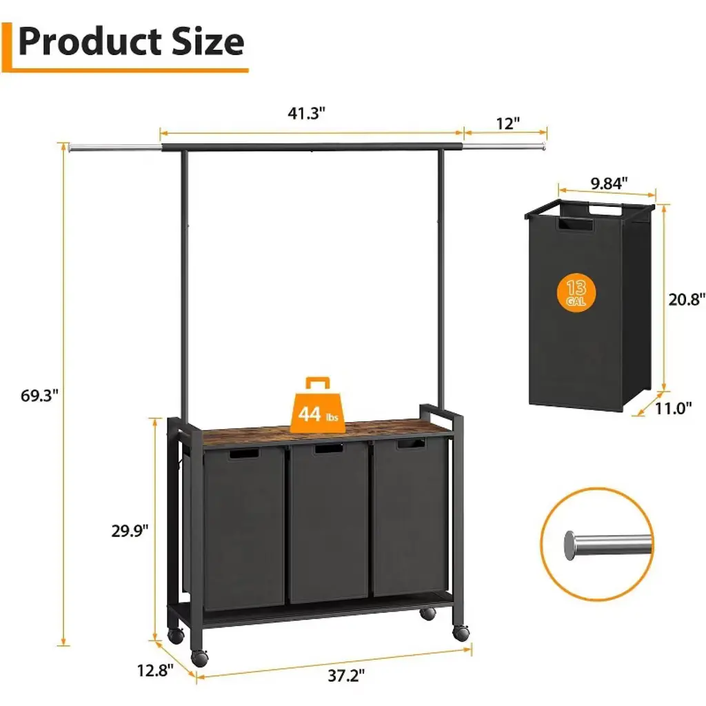 Large Laundry Sorter, Rolling Laundry Sorter Laundry Room Organization Laundry HamperTransform your laundry routine with our versatile rolling laundry sorter cart, featuring a spacious organizer, hanging bar, and easy-access folding table for ultimate efficiency and convenience! Highlights at a Glance:--Optimize your space with this versatile laundry organizer for efficient laundry room organization.--Enjoy the convenience of a rolling laundry sorter cart with smooth-gliding wheels for easy mobility.--Keep your laundry tidy with dedicated sections in this laundry sorter cart for hassle-free organization.--Perfect as a laundry station, it features a laundry room table for folding clothes and a hanging laundry rack for air-drying.--Enhance your laundry room with a functional laundry sorter with hanging bar for efficient storage solutions. Specification:Folding Clothes Table Load Capacity: 44 LbsSingle basket capacity: 13 GalMaterial: Iron, Wood, Oxford Fabric Packing List:1 x laundry sorter cart Friendly Note:1.Follow Assembly Instructions: Use the provided manual for assembly. Proper setup is crucial for the product's stability and performance.2.Utilize the Hanging Rack Wisely: Use the hanging rack for items that need air-drying or to keep clothes wrinkle-free. Ensure the hanging bar is not overloaded to maintain its integrity.