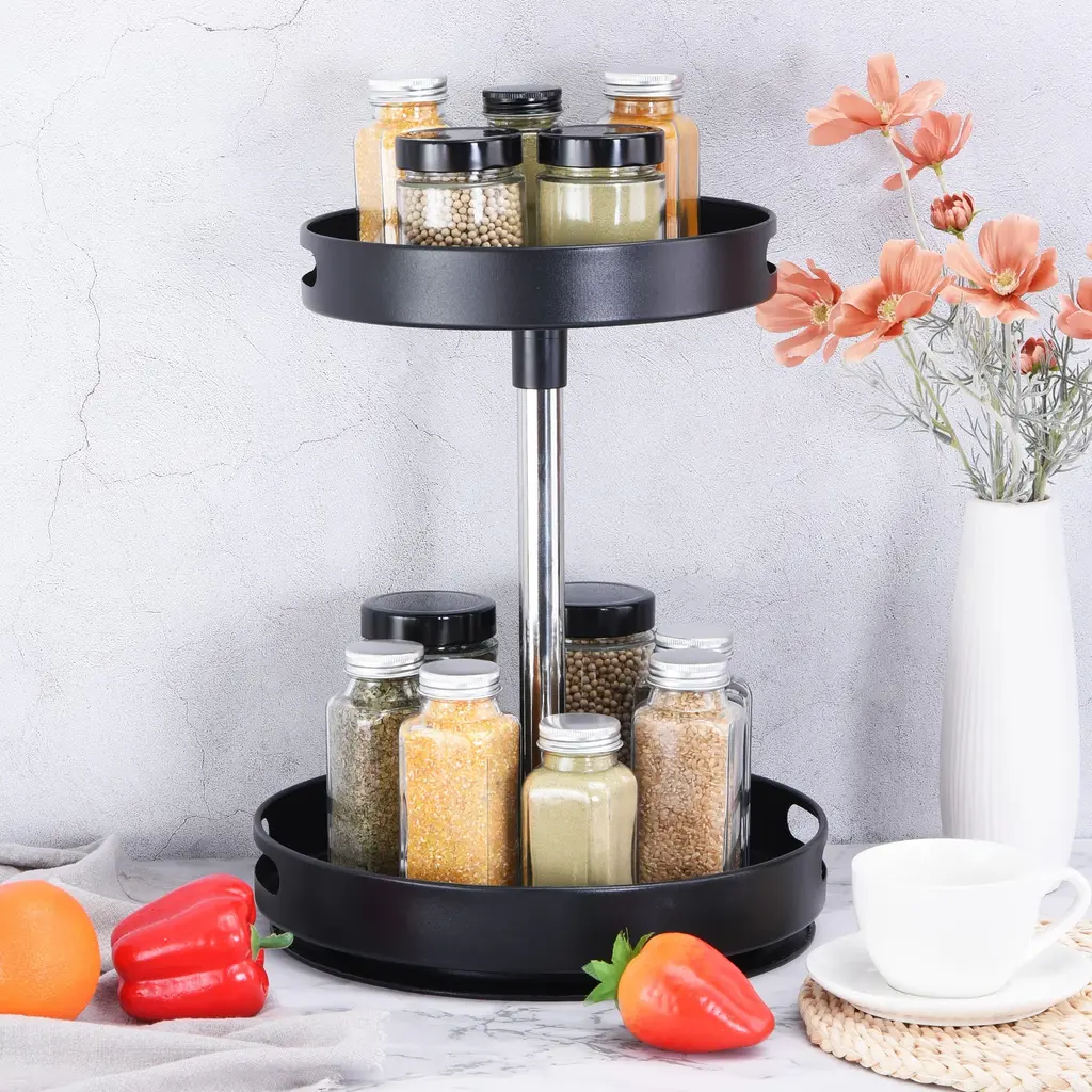 Durable Material - lazy susan organizer adopts carbon steel panel with coated finish, which is rustproof and durable. No more worry about make it as a bathroom storage or a condiment organizer. Abrasion-resistant coating of our lazy susan organizer can ensure long lasting usage and it's easy to clean. The 2 tier organizer helps you maximize on your limited space. Save your space and help you to access your pantry, cabinet, table, counter easily.360 Degrees Rotation - Spice rack's turntables can be smoothly rotated 360 degrees, great for deep cabinets, corner pantry or under the sink storage, make it easy to reach what you need without knock over any bottles. With non-slip surface and silicone pads, making more stable during use and prevent all bottles from falling out while turning the spice rack.Safe Raised Edges - Turntable organizer is a good way to keep your items in order and easy to get. The convex outer edge prevents objects from falling off, and the quality is assured to ensure that you are satisfied with your purchase. Open design make the items visible and easy to access. Easy to Install and Clean - Cleaning and organization rack is designed specifically for keeping your table clean and organized. The height adjustable feature allows you to customize it to your needs, while the rotating design makes it easy to access your spices. This rotating spice rack organizer is detachable. You can easily assemble it. If you don't use it, you can disassemble it to save space. The lower layer can be used separately. Wide Application - This rotating organizer can be used in kitchen countertop or cabinet pantry storage ,also suitable for bathroom, refrigerator, office, bedroom, living room, laundry room. Widely used to organize spice seasoning bottles,food jars, cosmetics, bath supplies, skin care products, nail polish, drinks snacks etc.