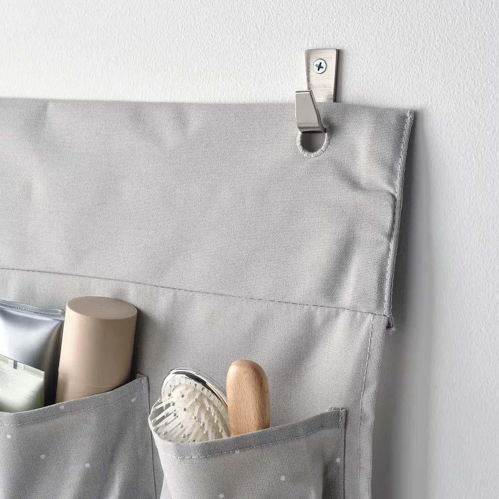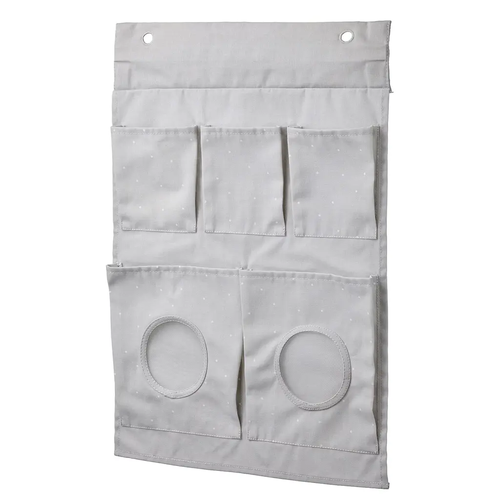 LEN Hanging storage - dotted/light gray 17 ¾x25 ¼ ". You can fix the storage over the edge of the changing table or hang it on hooks on the wall. Simple to hang up and just as simple to take down and carry around since the storage is lightweight. Can be folded to save space when not in use.