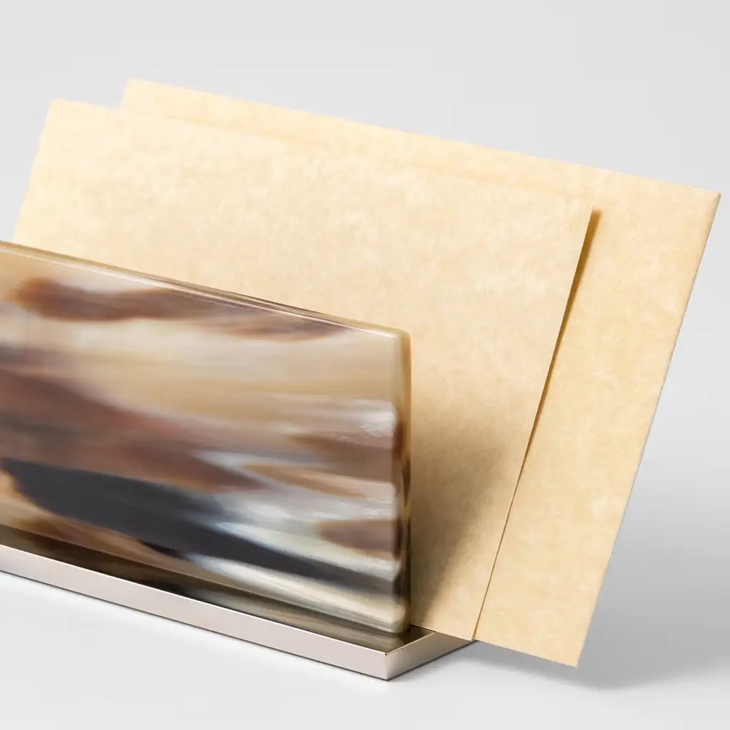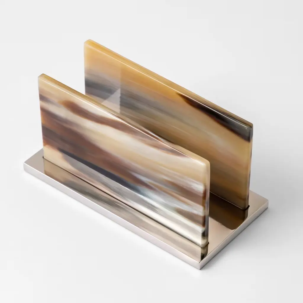 Add sophistication to an office decor with this superb horn mail organizer, expertly crafted with elegance and efficiency in mind. The natural horn is featured in two staggered panels set atop a nickel-plated brass base. The horn is polished with wax to bring out its stunning natural properties. Variations in color and striations may vary slightly from the pictured item. Part of the Leonardo Collection.