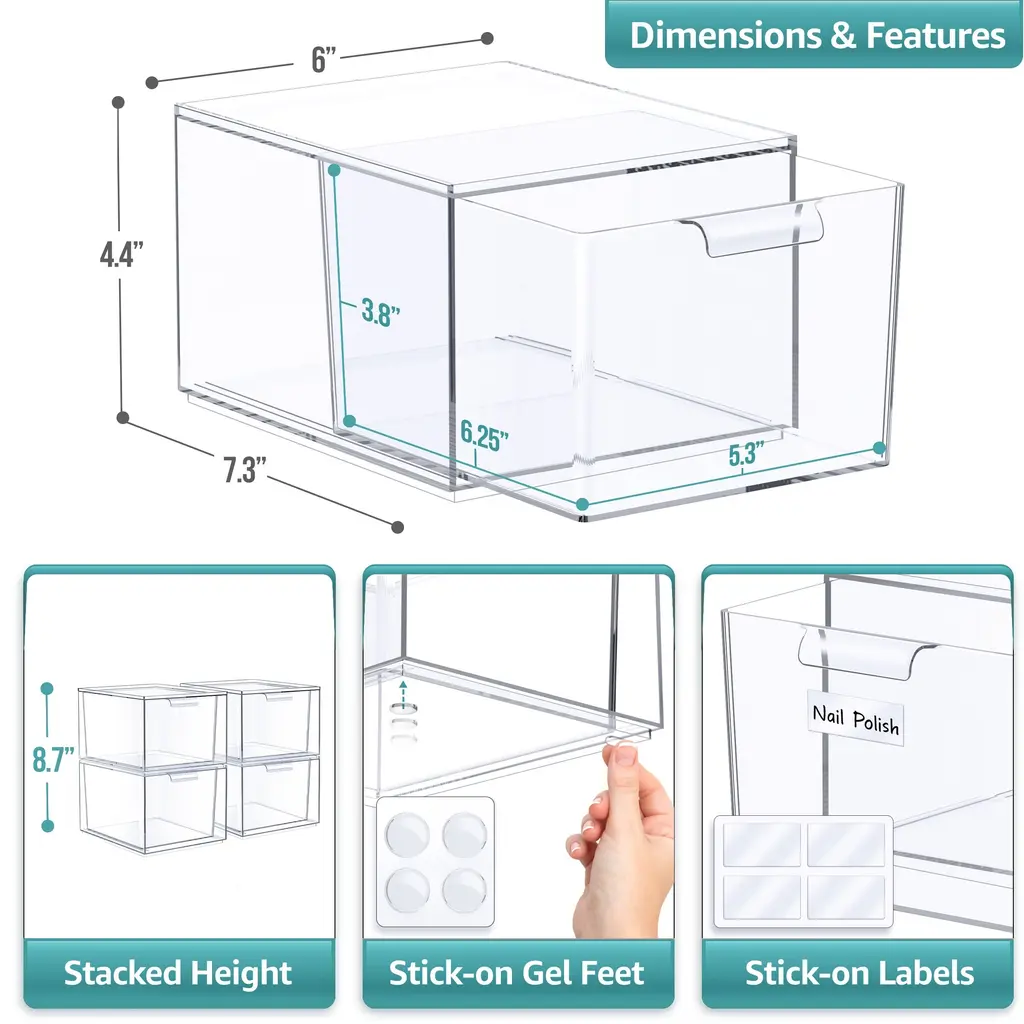 Organize your cosmetics with Sorbus Clear Drawer Organizers. These acrylic drawers feature a stackable design, easy-pull handles, and transparent plastic for efficient storage. Use them for makeup, hair accessories, or office supplies. Customize and expand as your collection grows. The high-quality acrylic and clear design offer both durability and visibility. Reduce clutter, save space, and streamline your routine with these stylish organizers, measuring approximately 7.4in x 6in x 4.4in each.