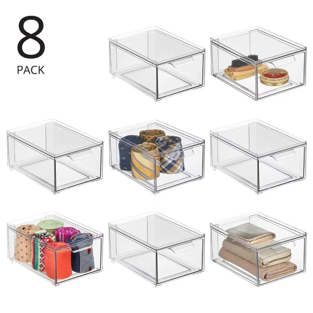 Mdesign Stacking Plastic Kitchen Pantry Bin - 2 Pull-out Drawers - 8 Pack, Clear