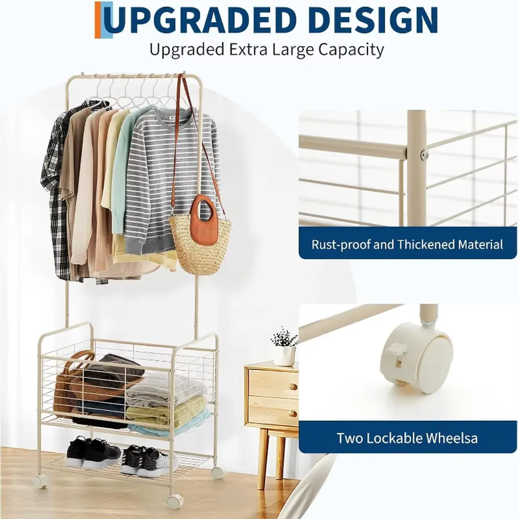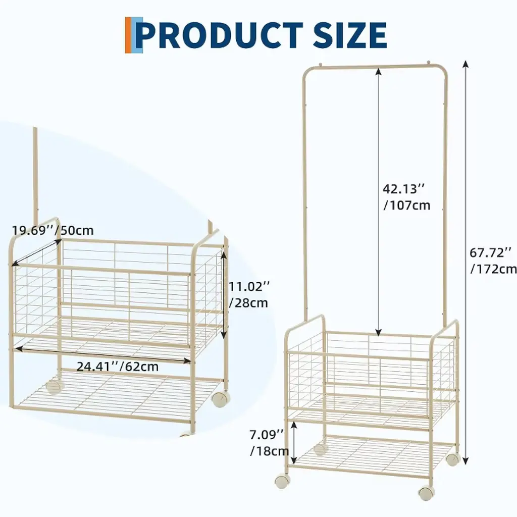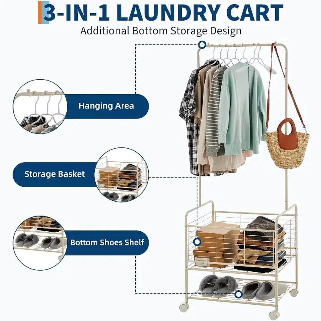 Metal Laundry Cart With Hanging Rack & Storage Shelves | 3-in-1 Rolling Hamper With Wheels For Clothes, Towels And Toys | Space Saving Organizer