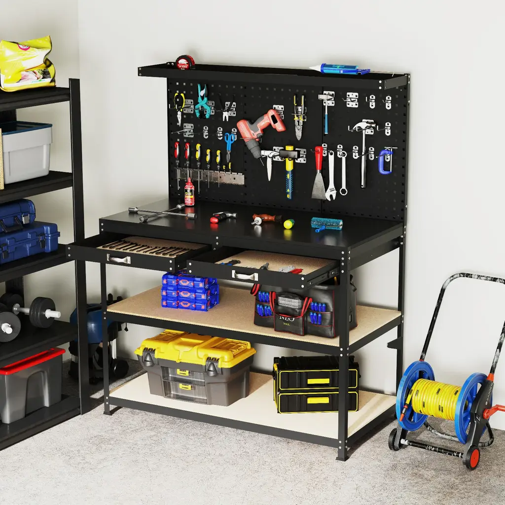 Metal Workbench With Pegboards, Drawers And Tool Organizer For Heavy-Duty Use - 48" X 24" X 62" (L X W X H) - Black
