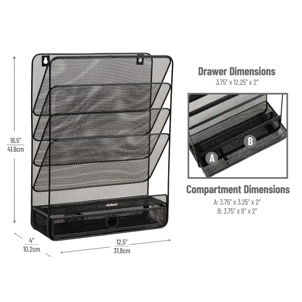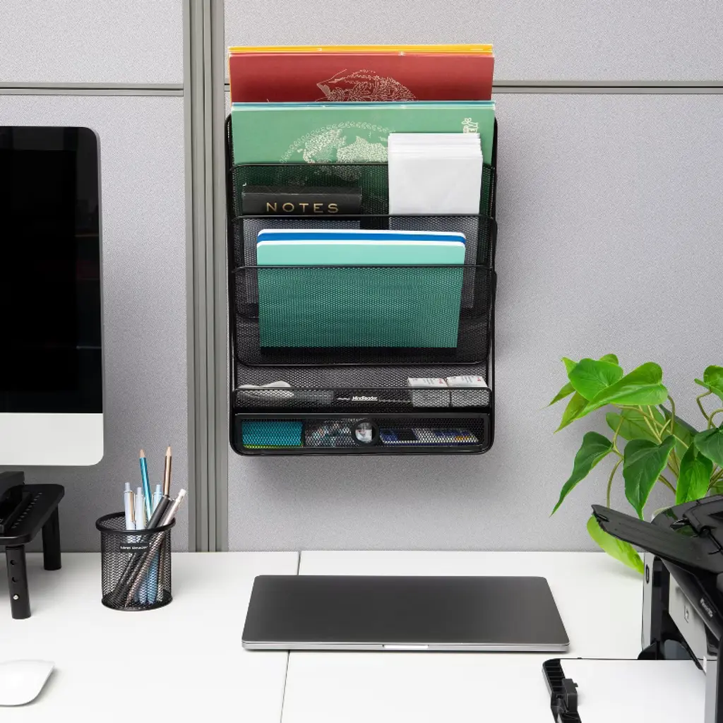 Efficient Workspace with a 4-Tier Vertical File Holder Having all your essential documents and files properly stored and easily accessible can significantly streamline your workflow. This vertical file holder gives you the ability to categorize and retrieve your important files quickly, boosting productivity and freeing up valuable time. Don't be misled by its lightweight design; our file holder is built to last. Constructed from sturdy metal, it combines durability and stability. From its angled compartments that keep your files in place, to the easy-to-maintain finish, every detail of this file holder is designed to last. Installation is a breeze. All you need to mount this storage rack is a screwdriver and level—or a good eye for straight lines—and in no time, you'll have control over your organizational challenges. This 4-tier organizer makes a fantastic addition to any work area and also serves as a thoughtful gift for graduates venturing into the working world or for anyone who needs to keep track of various papers in one organized place.