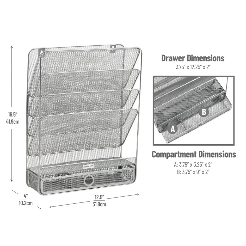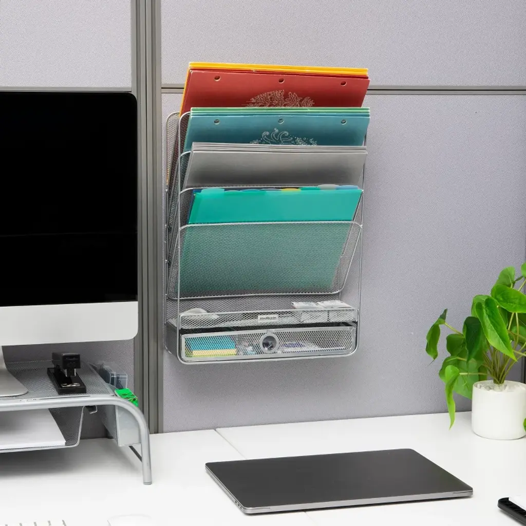 Efficient Workspace with a 4-Tier Vertical File Holder Having all your essential documents and files properly stored and easily accessible can significantly streamline your workflow. This vertical file holder gives you the ability to categorize and retrieve your important files quickly, boosting productivity and freeing up valuable time. Don't be misled by its lightweight design; our file holder is built to last. Constructed from sturdy metal, it combines durability and stability. From its angled compartments that keep your files in place, to the easy-to-maintain finish, every detail of this file holder is designed to last. Installation is a breeze. All you need to mount this storage rack is a screwdriver and level—or a good eye for straight lines—and in no time, you'll have control over your organizational challenges. This 4-tier organizer makes a fantastic addition to any work area and also serves as a thoughtful gift for graduates venturing into the working world or for anyone who needs to keep track of various papers in one organized place.