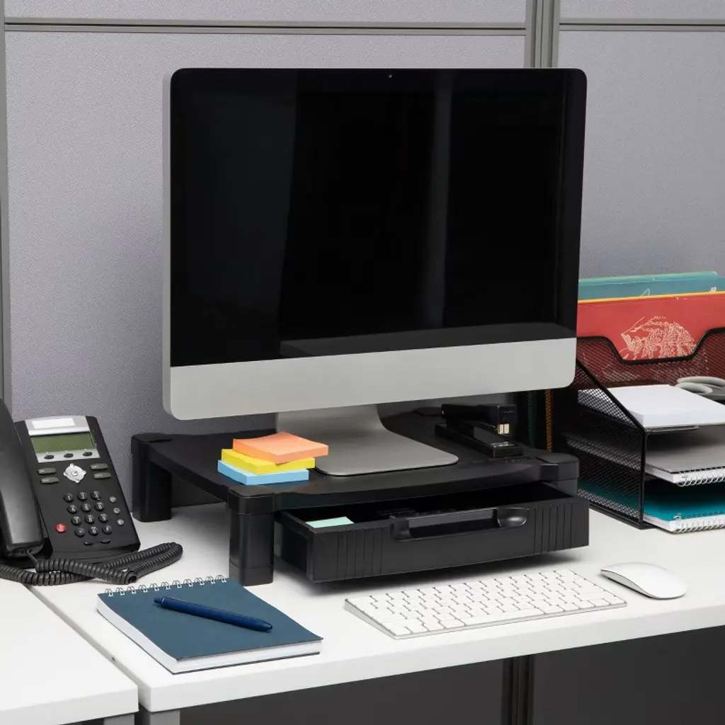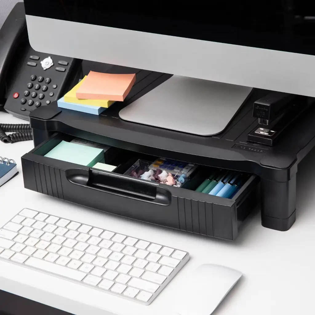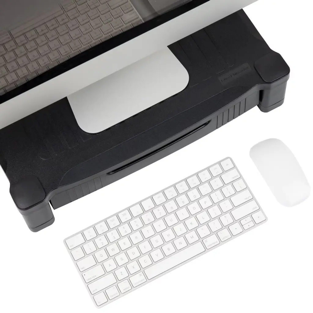 Upgrade Your Workspace with an Ergonomic Monitor Riser StandEnhance your workspace with this ergonomic monitor riser designed to alleviate neck, shoulder, and eye strain by raising your monitor to eye level for better posture and comfort. The compact and efficient design saves valuable desk space by providing storage for your modem, notebooks, tablet, and other accessories, while the built-in drawer keeps your documents and essentials organized.Featuring a sleek and modern design, this black monitor stand riser blends in with existing electronics and decor, and the cable management system keeps cords neat and tidy. Built to last with a sturdy resin polycarbonate construction, this stand supports up to 22lb (10kg) and features surface-gripping feet for stability.Measuring 17.25 x 13.25 x 4 inches and weighing 3.48 lbs, the monitor riser stand is ideal for most devices and offers generous storage space for essentials. A perfect gift for students, home or office workers, or anyone with a computer monitor, this riser stand and other Anchor Collection products can transform your workspace into a more comfortable, organized, and efficient environment.