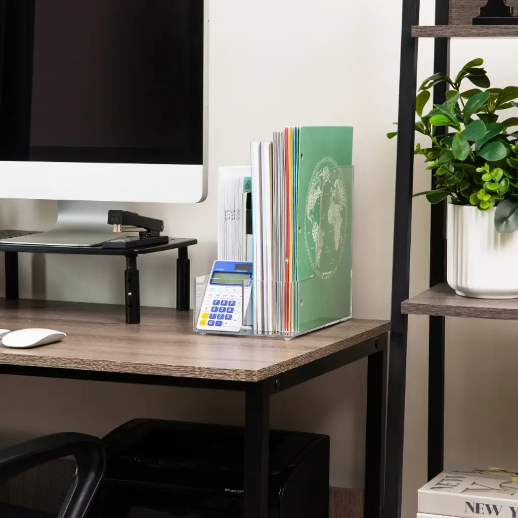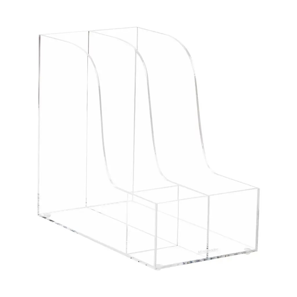 Streamline Your Workspace with a Vertical File Holder Boost your workspace efficiency and style with our two-section acrylic file organizer, the left side has a small section in the front for pens, scissors and other essentials. Its sleek design seamlessly integrates with any office decor, keeping your files organized and accessible while adding a touch of sophistication. Maximize your desk space with this compact organizer, which fits snugly on your desk while offering ample storage for tall and wide items. Say goodbye to clutter and hello to a more productive work environment. This organizer not only adds style but also enhances productivity by keeping your desk clear and your files neatly sorted. Focus on your tasks without distraction, knowing everything is in its place. Built for durability, this lightweight holder is perfect for storing multiple files. Use it on your desk, shelves, or in cubbies for additional organization. Maintenance is easy—just wipe with mild detergent or a dry cloth to keep it looking its best. With dimensions of 6"L x 11"W x 9.75"H, this organizer is ideal for holding folders, magazines, and more.