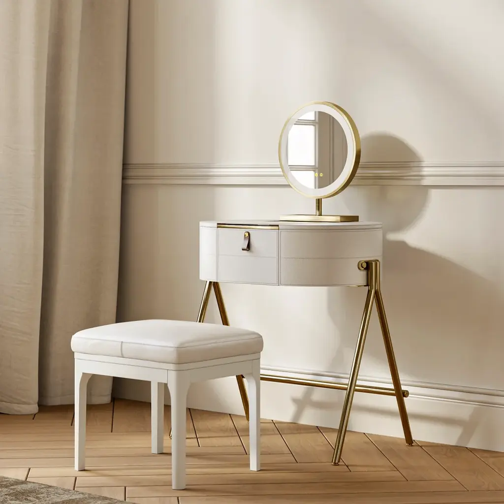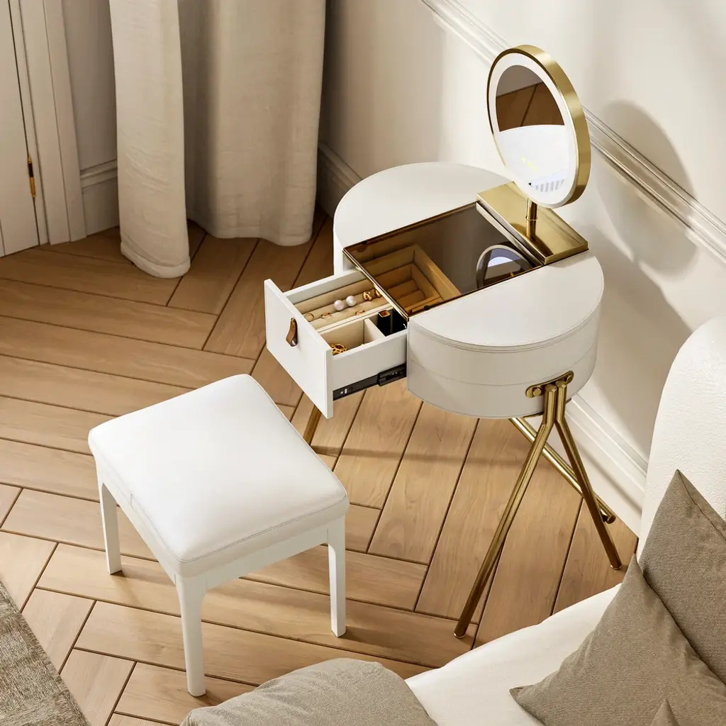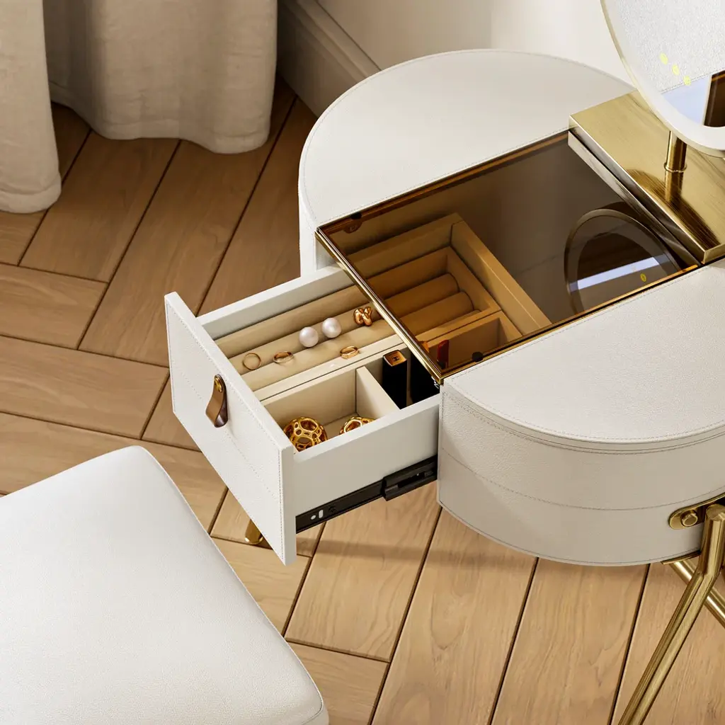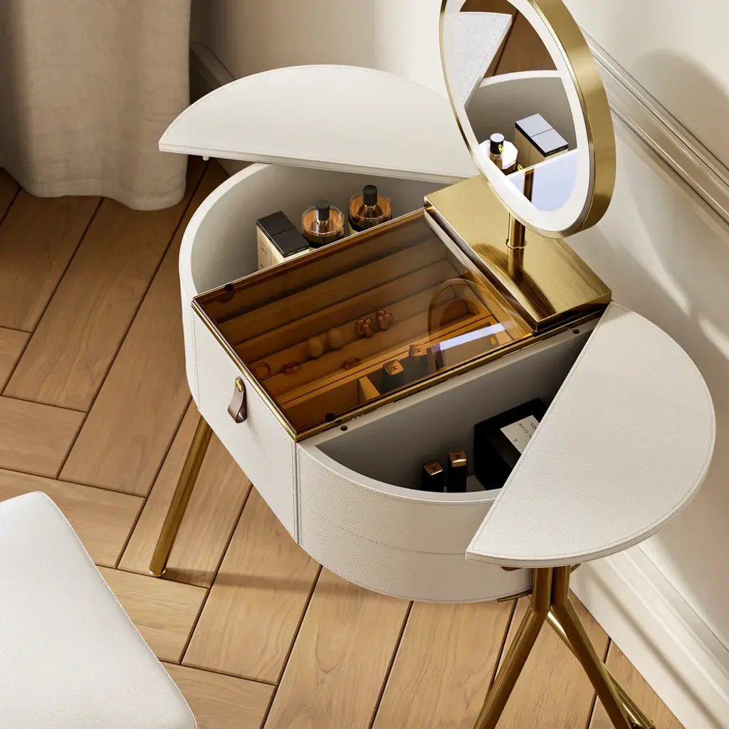 Elevate your daily ritual with this compact vanity, featuring a sleek tempered glass top, a jewelry organizer, and magnetic lift-top compartments that reveal hidden storage for skincare, perfumes, and beauty essentials. Wrapped in refined upholstery with warm metallic accents, it’s a statement piece that blends modern elegance with everyday functionality—perfect for bedrooms, apartments, or any space that deserves a touch of luxury.