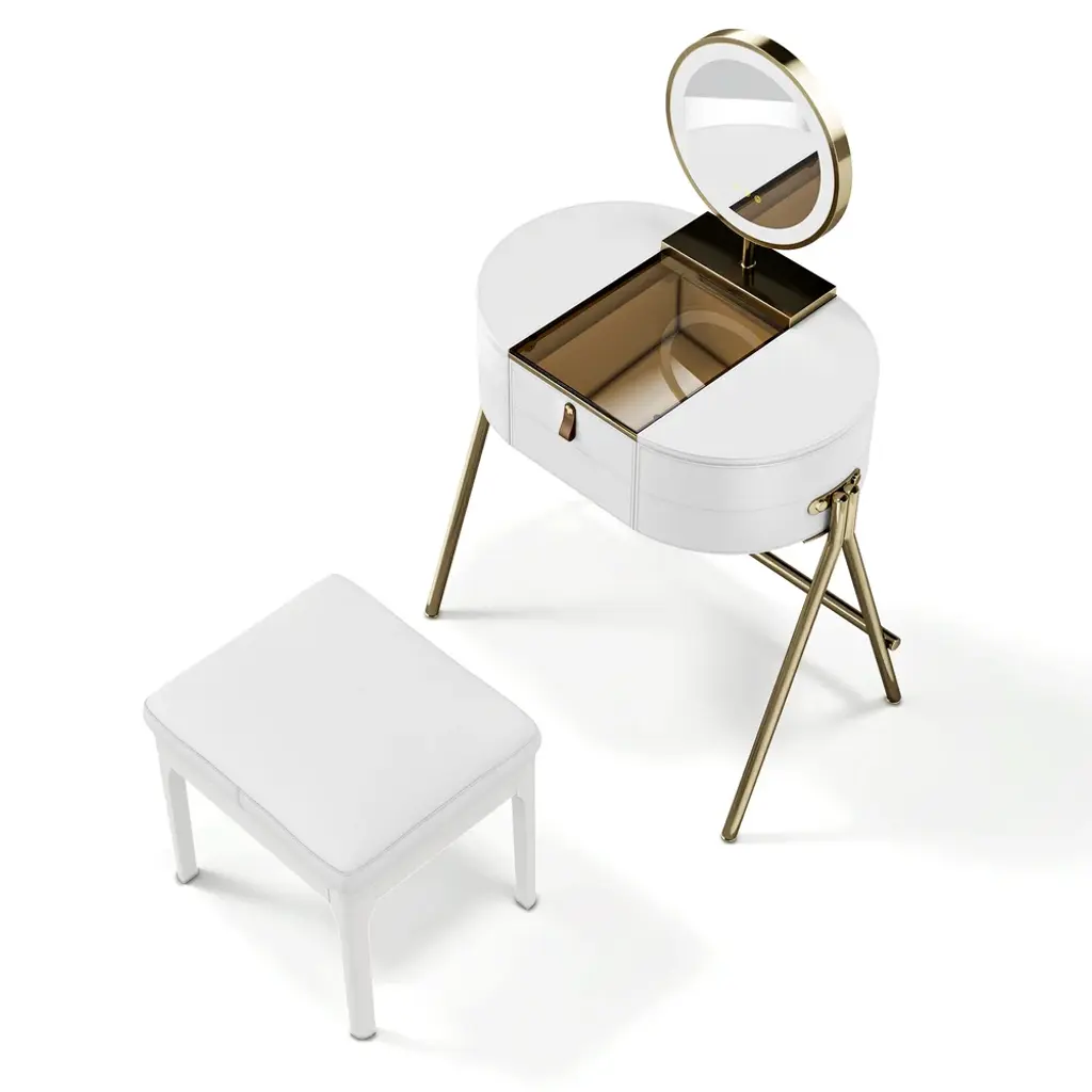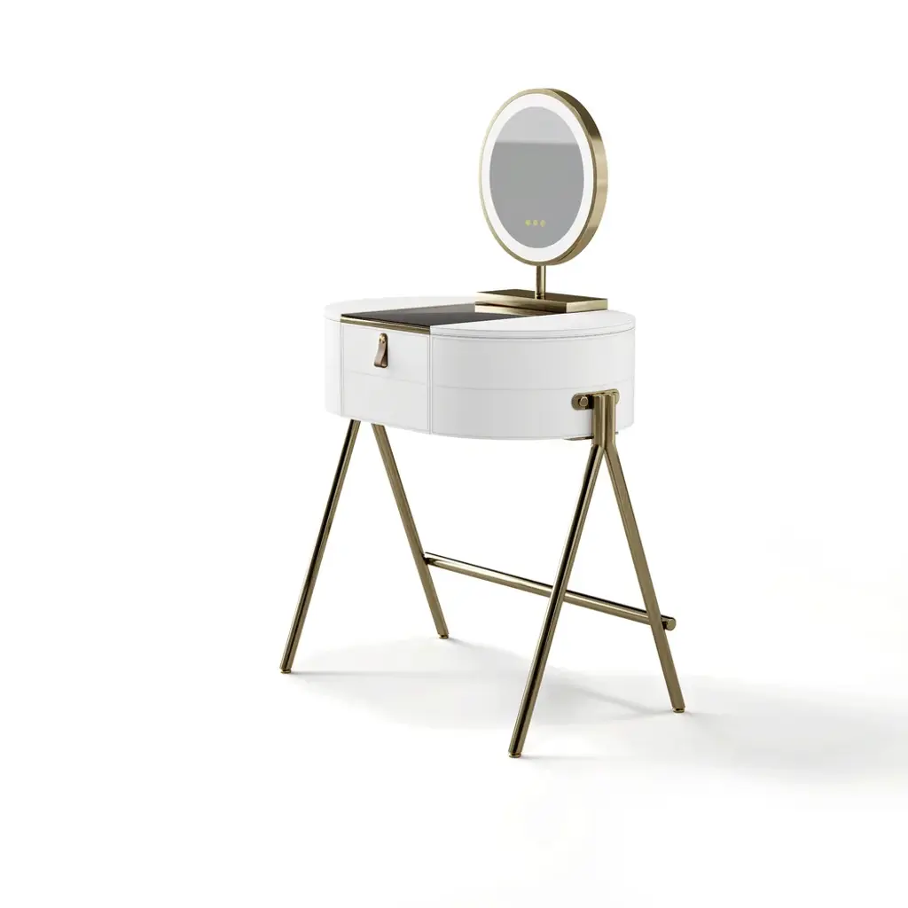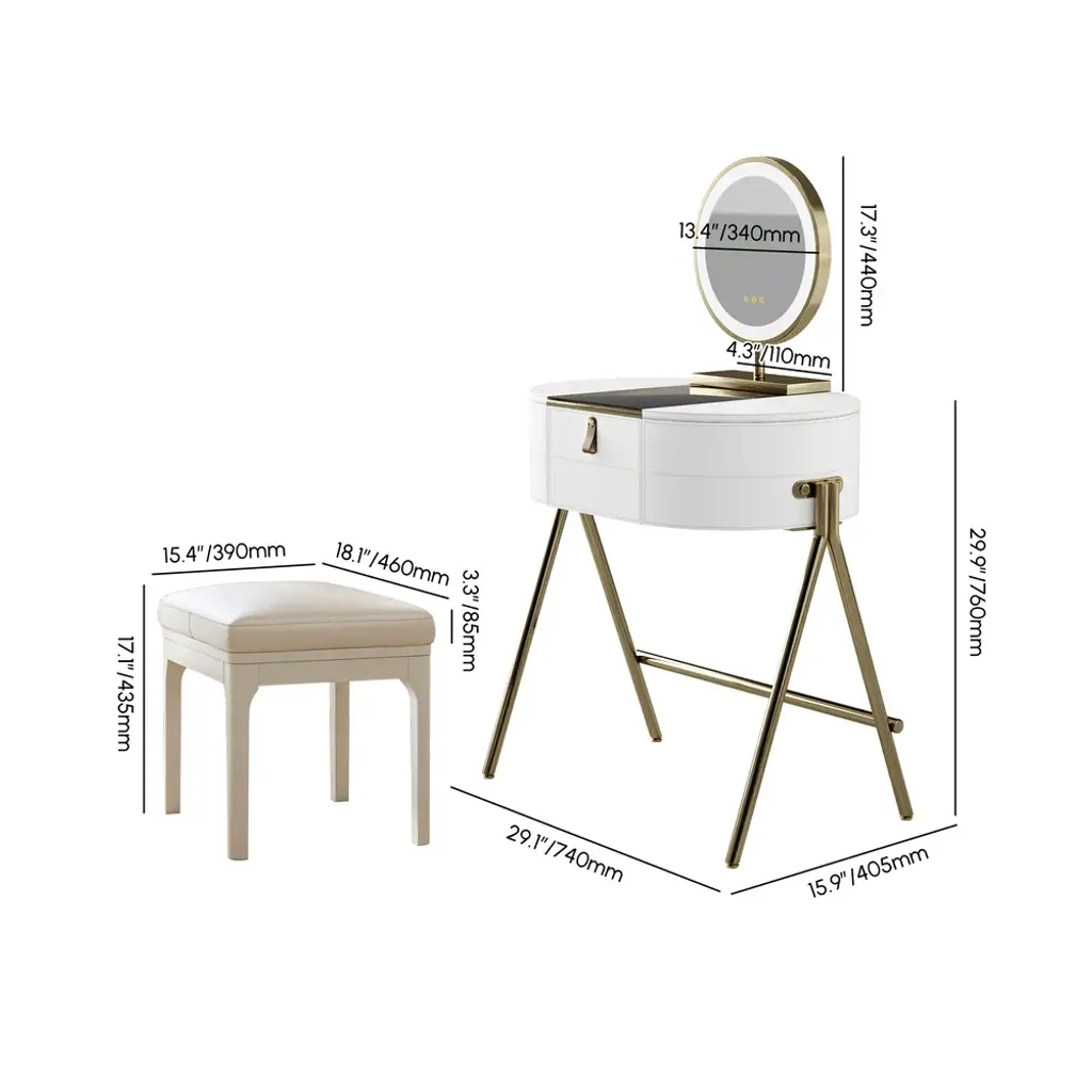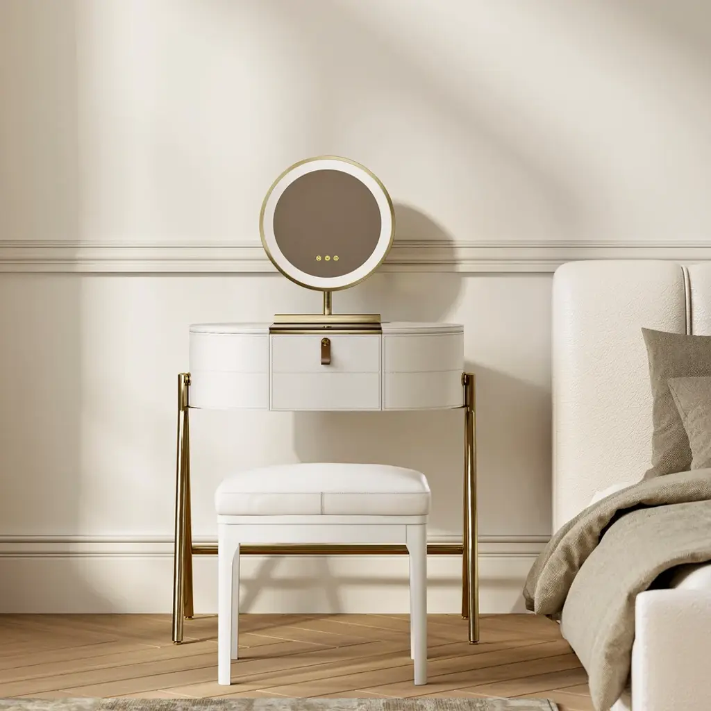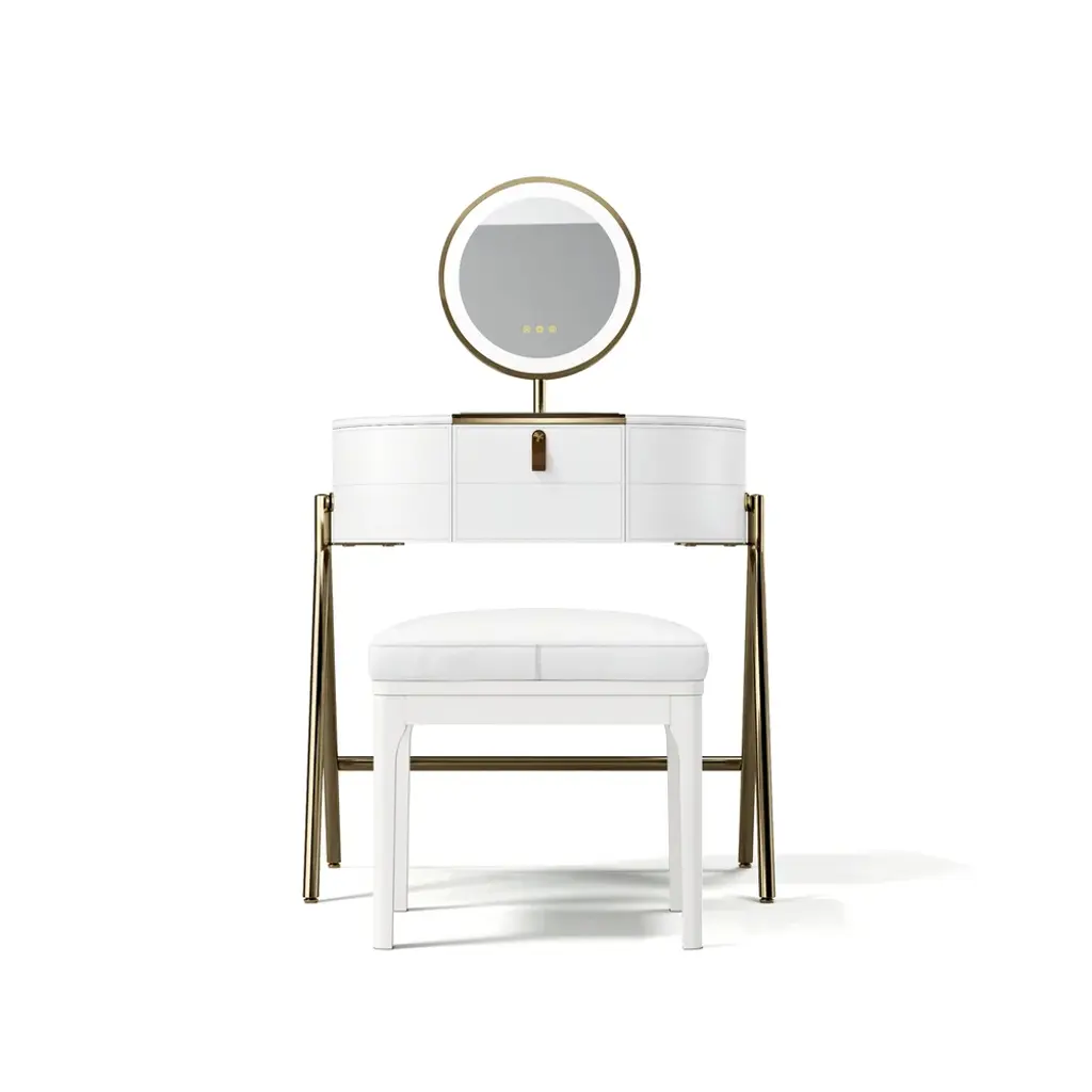 Elevate your daily ritual with this compact vanity, featuring a sleek tempered glass top, a jewelry organizer, and magnetic lift-top compartments that reveal hidden storage for skincare, perfumes, and beauty essentials. Wrapped in refined upholstery with warm metallic accents, it’s a statement piece that blends modern elegance with everyday functionality—perfect for bedrooms, apartments, or any space that deserves a touch of luxury.