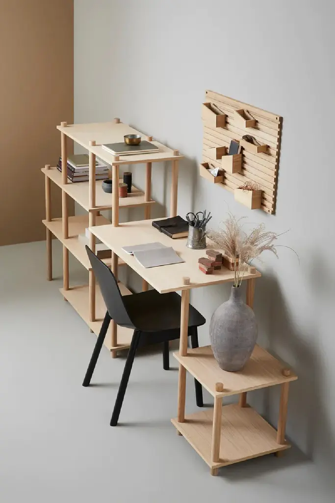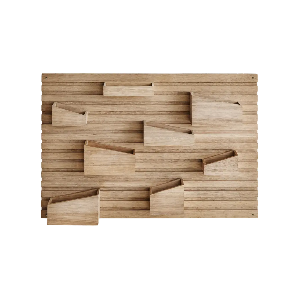 Input is a flexible organizer with eight movable boxes in different dimensions and shapes. Allowing you to create the exact expression you want - matching your needs and taste. The softness of the oak complement the graphic and angular lines of the organizer and pockets. The design is a perfect solution to organize small everyday essentials in the hallway, office, or bedroom.