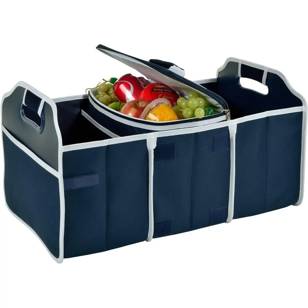 Durable 3 section trunk organizer with cooler is great organizing sports gear, tailgating, camping, or groceries. It's padded base and rigid support in all sides and between each section prevent sagging and add durability. Padded and reinforced handles make transport a breeze. Extra side pockets add storage. Dimensions Open - 23" L x 14" D x 12'' H, collapsed - 2" L x 14" D x 12" H Constructed with a rugged 600 denier polyester canvas with sewn in side supports to prevent sagging Includes a removable cooler constructed , heat welded leak-proof liner Organizer opens into 3 sections - great for groceries - sports gear - kids stuff- travel items etc., 2 external pockets for maps etc. Reinforced handles at each end make it easy to move in and out of the trunk or into the home - organizer and cooler fold flat when not in use Designed by Picnic At Ascot in USA - Lifetime Warranty 600D Polycanvas Spot Clean and Air Dry Imported