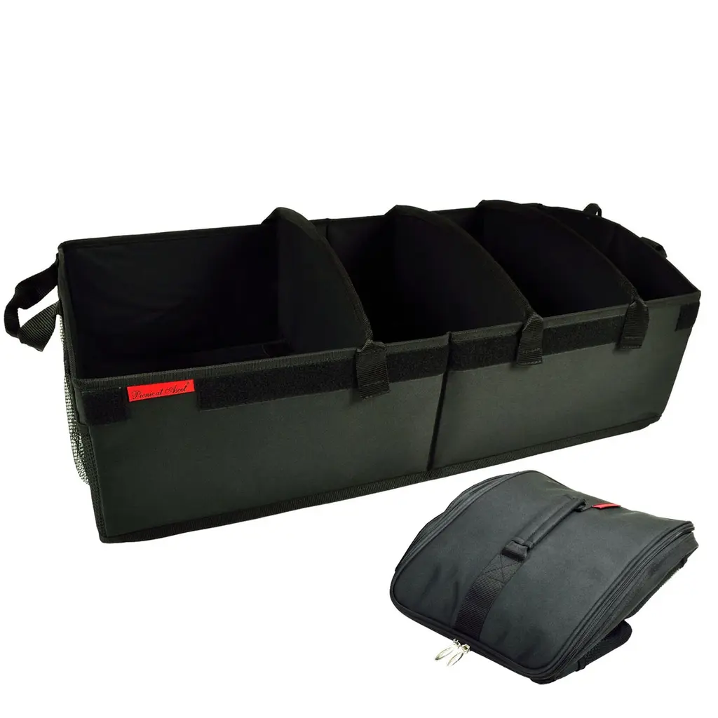 Picnic at Ascot Designers and manufacturers for over 25 years of a wide range of high quality picnic baskets, coolers, wine carriers and lifestyle products Heavy Duty Trunk Organizer for Cars, SUVs, and Mini Vans. 70 lbs. Load Capacity. Includes a Removable Leakproof Cooler - Holds 28 Cans Durable: Built to last - Constructed from 600 denier canvas reinforced with a water-resistant backing. Adjustable dividers can be easily secured anywhere inside the organizer to fit all shapes and sizes: bottles, sports equipment, toys and tools. Three dividers included. Rigid non-slip base and hard sides, exterior mesh pockets, folds to save space. A great gift idea: surprise your friends and family, ideal for housewarming, engagement, wedding, anniversary, retirement, birthday, Christmas, holiday or hostess gift