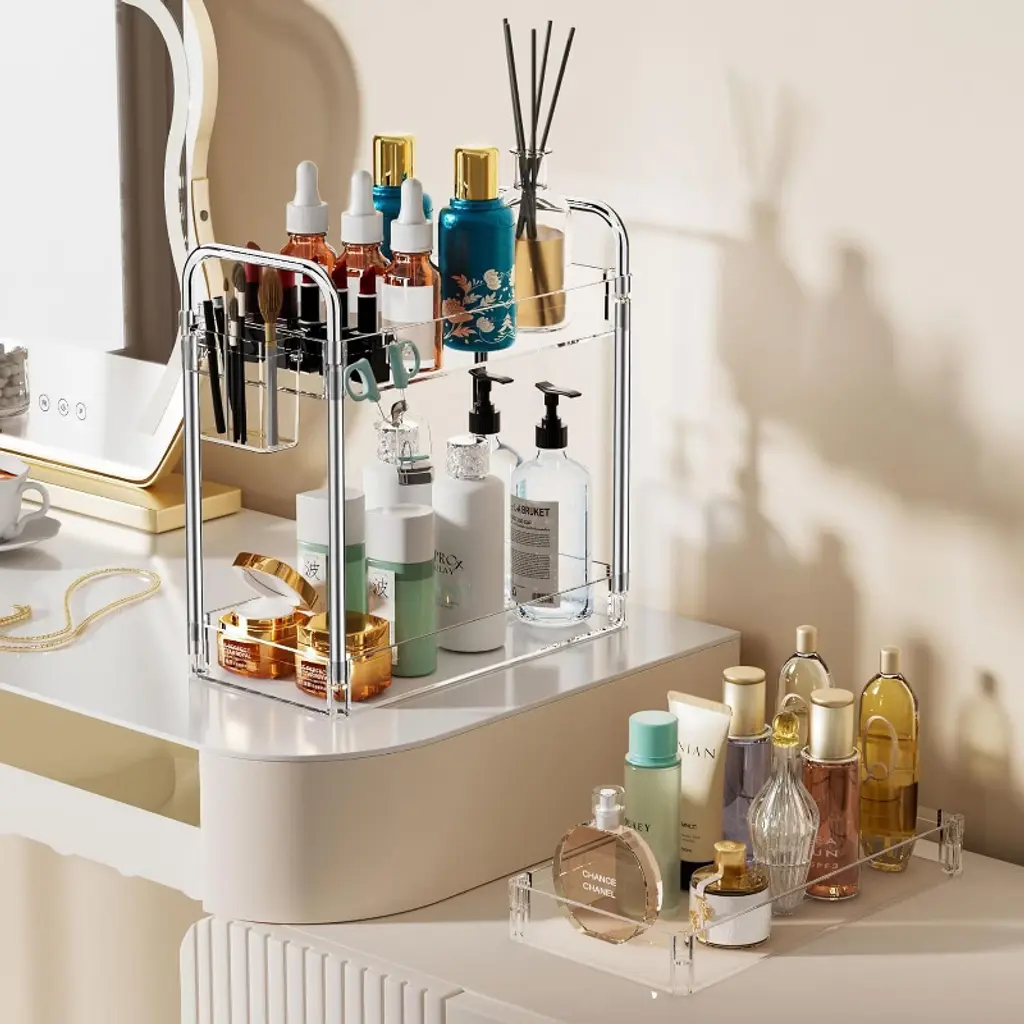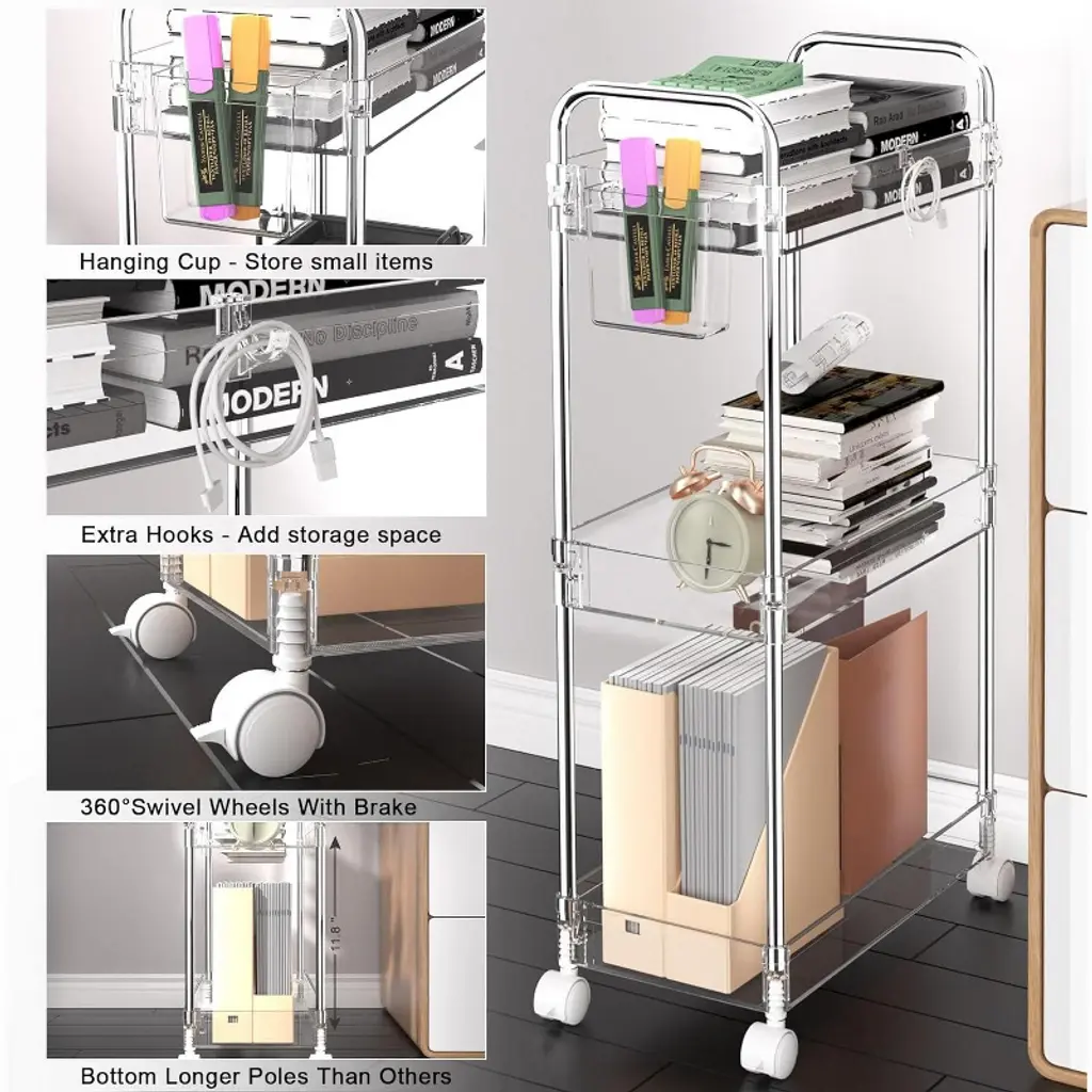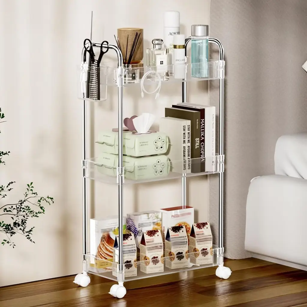 The product is made of high-quality acrylic material with high transparency, which is not only beautiful and fashionable, but also allows users to easily find and retrieve stored items at a glance. Acrylic material also has good durability, is sturdy and not easily deformed, and can withstand a certain weight of items. The three-layer design provides a large storage capacity, which can be classified to store various items, such as shampoo, shower gel, towels, etc., which can be placed in the bathroom; Laundry detergent, fabric softener, hangers, etc. can be placed in the laundry room; Files, folders, office supplies, etc. can be placed in the office; Snacks, magazines, remote controls, etc. can be placed in the living room to help users effectively organize their space and make items more orderly.