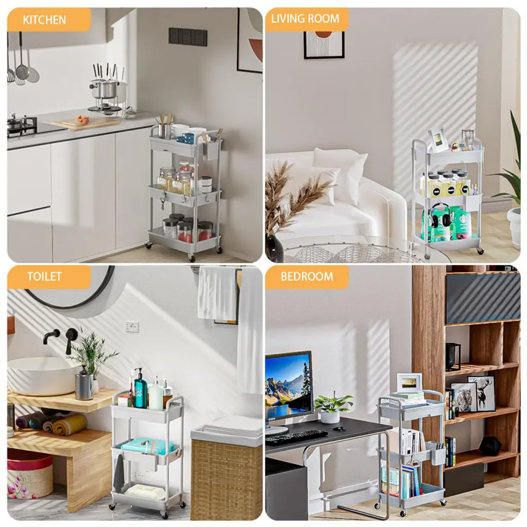 storage shelves Save space and declutter any room with this storage cart with ample shelf space to hold household items or office supplies.