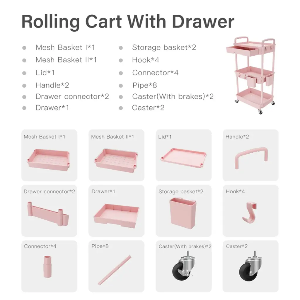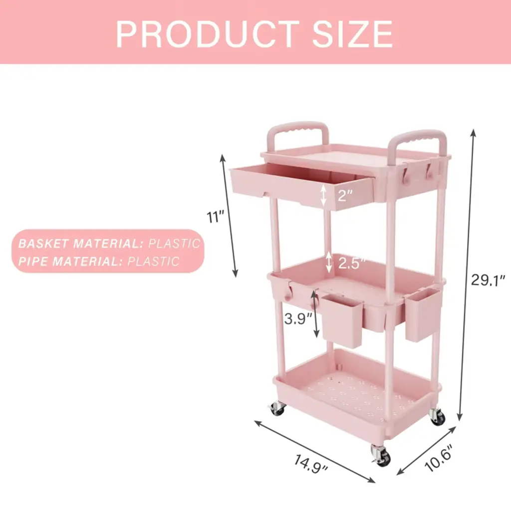 Obokata 3 Tier Rolling Utility Cart With Drawer,storage Cart,rolling Cart For Kitchen,bathroom,living Room,storage Organizer With Iron Wheels("pink)
