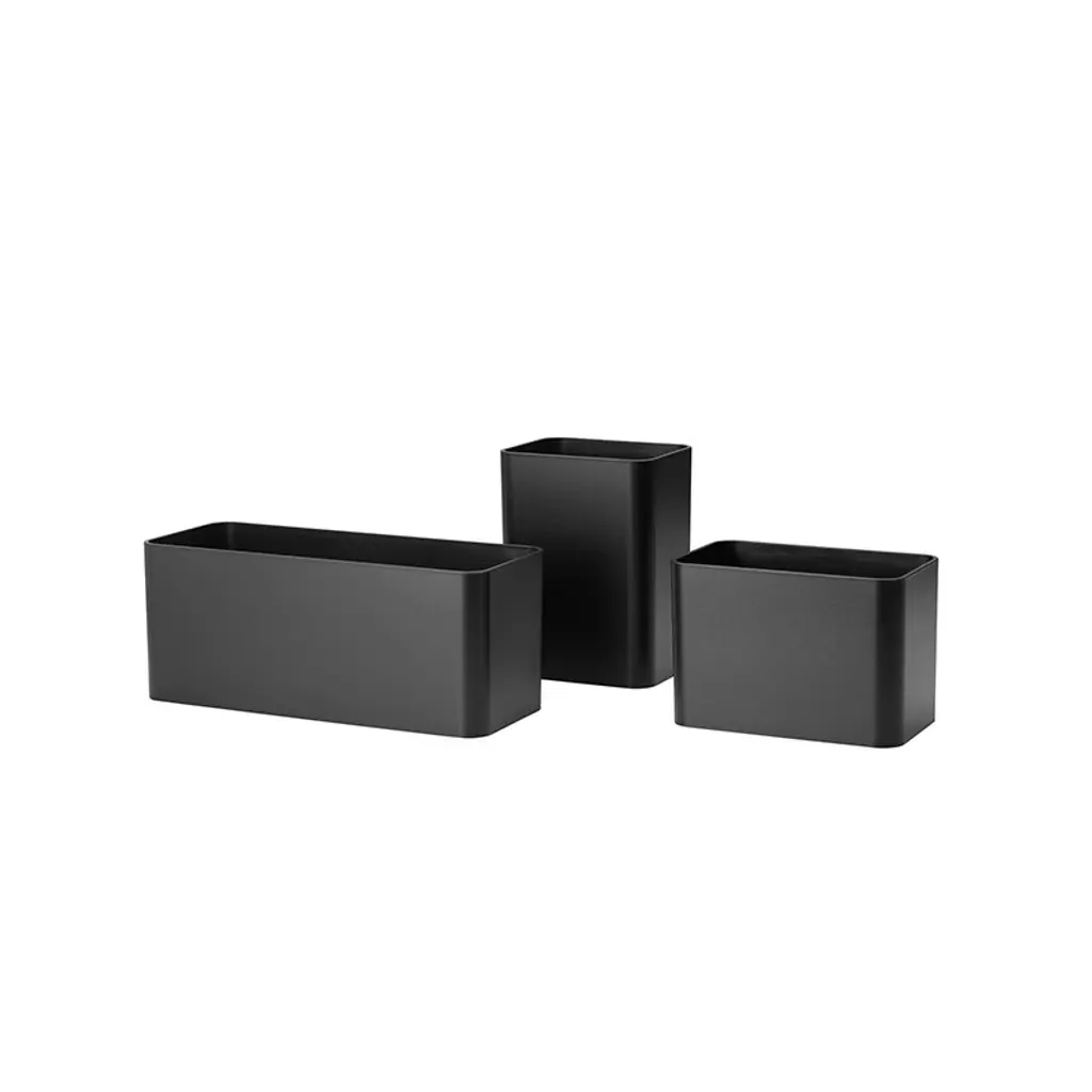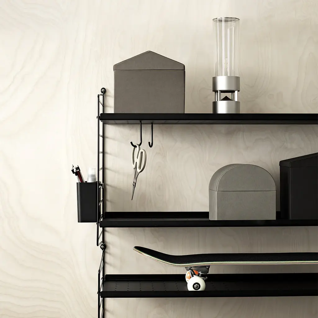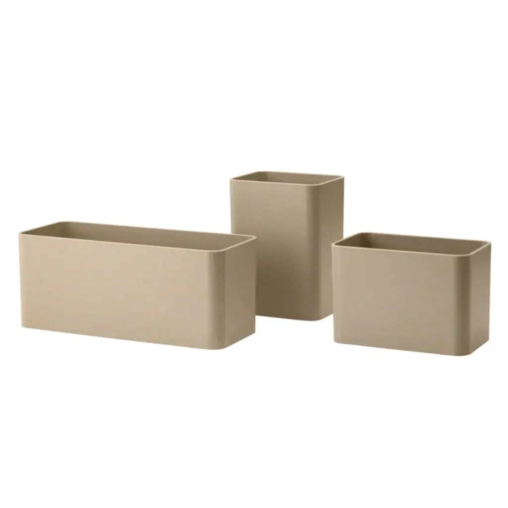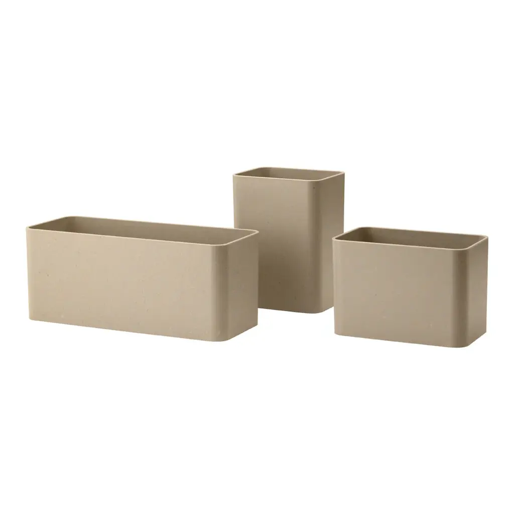 The organizers are part of our range of accessories. The organizers fit together with 30 cm deep wire panels from String® System and the wire screen from Works. Let the organizers spark your creativity and keep your pens in one of them, rulers in the other and why not plant something in the third. They are also a great help in the kitchen since they can store your kitchen utensils. The organizers are made of biocomposite material containing 40% wood fibres. Each packaging contains three organizers in the following sizes: (1) w9 x d7 x h12 cm (2) w20 x d8 x h8 cm (3) w12 x d7,5 x h8 cm.