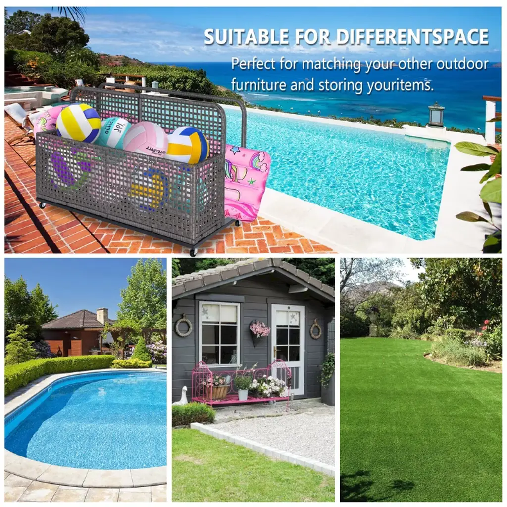 Maximize your poolside organization with this stylish outdoor wicker storage caddy. Built from handwoven PE rattan and a sturdy powder-coated steel frame, it¡¯s designed to endure outdoor elements while keeping all your pool floats, noodles, life vests, and toys neatly organized. The open-sided basket, dual tracks, and foldable racks offer versatile storage options, while smooth-rolling wheels with locking brakes ensure mobility and stability. Assembly is simple, and maintenance is minimal, making this storage cart a smart and durable solution for any pool or patio area.