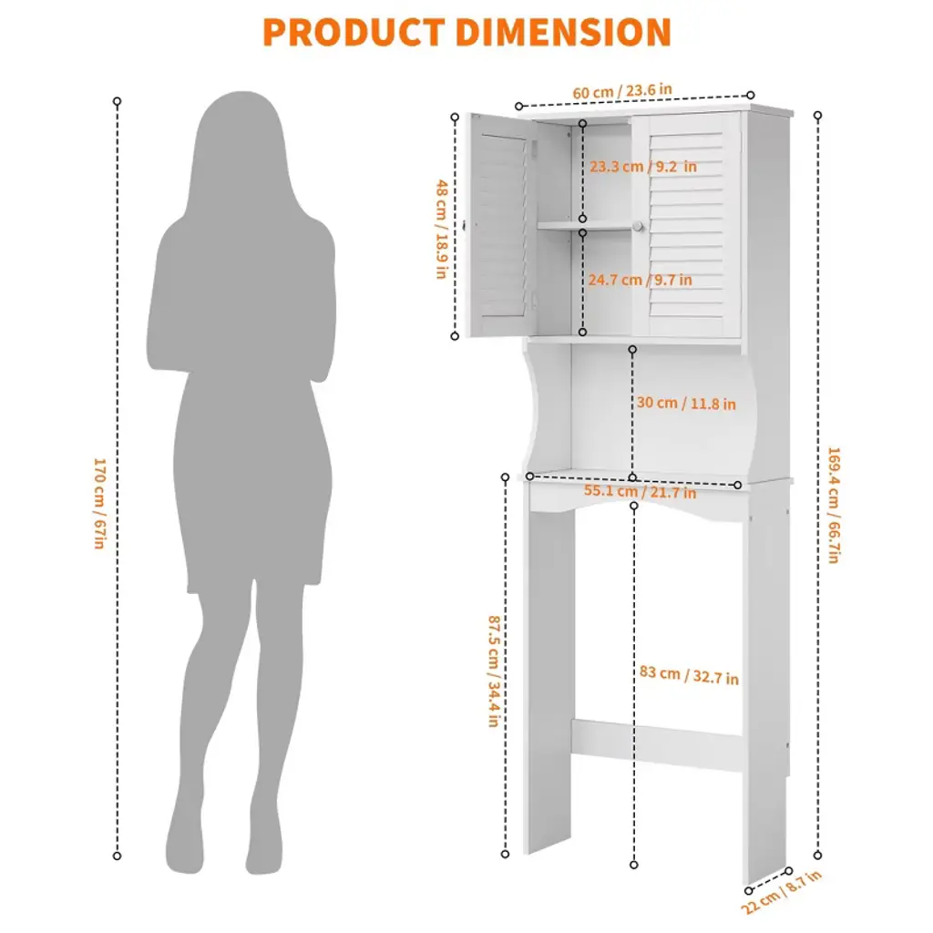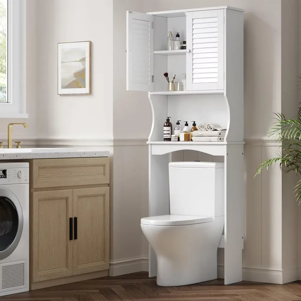 This over-the-toilet storage cabinet combines a two-door closed compartment with an open shelf, offering versatile storage for both discreet stowing and quick access. The adjustable interior shelf (up to 12.2 inches high) can be customized to fit everything from small toiletries to large detergent bottles, maximizing organization in any bathroom layout.