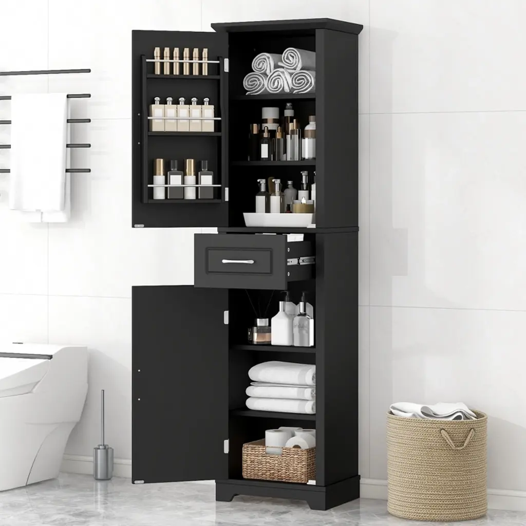 Parameters:Material: Premium engineered wood for enhanced durability and a sleek finishDimensions: Designed to fit standard bathroom spaces above the toilet (specific dimensions should be confirmed)Storage Features: • Double-door cabinet with adjustable shelf for customizable storage • Three open shelves for easy access to daily essentials • Built-in toilet paper holder • Spacious top shelf for additional storage or decorative itemsSafety: Includes anti-tip safety strap to secure the cabinet firmly to the wallFinish: Smooth, paint-coated wood surface for easy cleaning and maintenanceAssembly: Comes with detailed, easy-to-follow instruction manual for quick setup