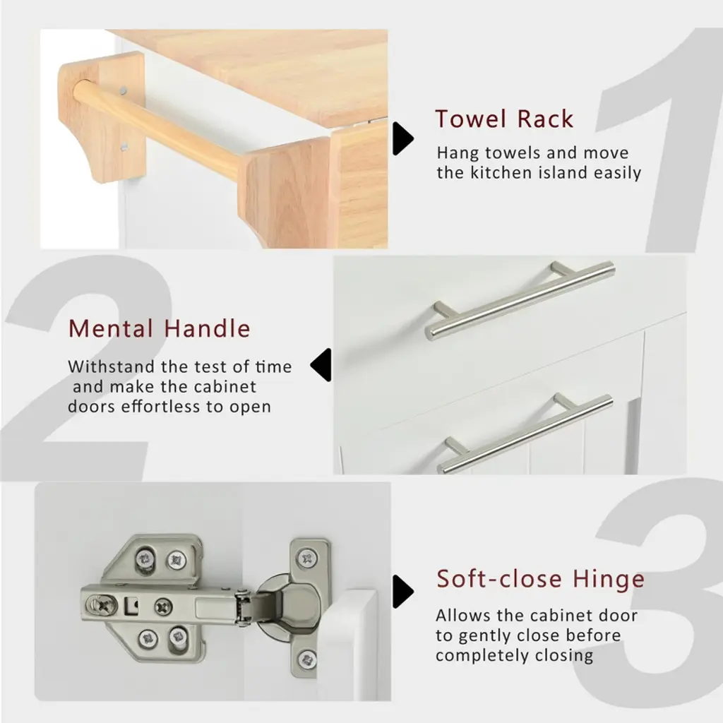 The kitchen island is constructed with sturdy and durable materials, providing reliable support and long-lasting performance for daily kitchen activities. Provides a spacious and practical workbench, perfect for cooking and other household chores. Optimized space utilization while maintaining the cleanliness and accessibility of essential items. Providing multiple uses in different areas of the home, from the kitchen to dining spaces, enhances practicality in various daily scenarios.