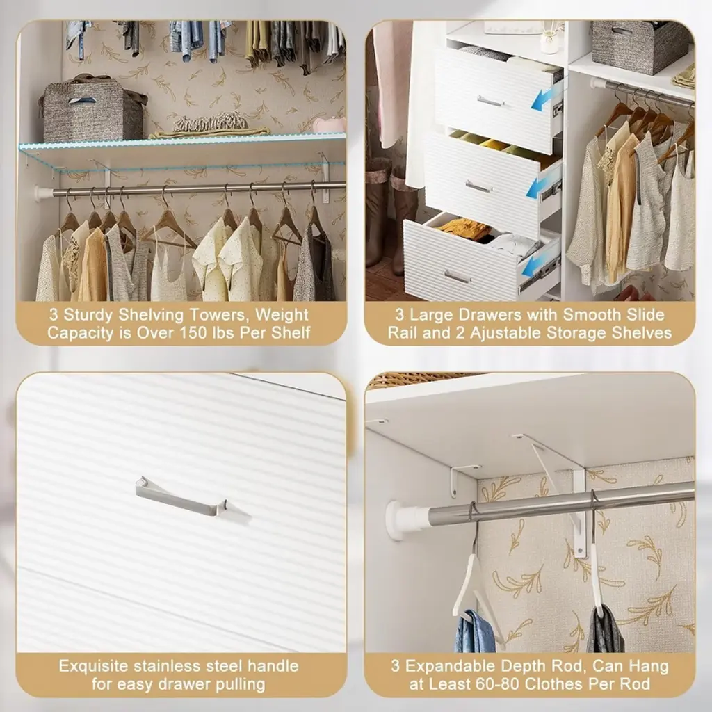 Pakasept 20.1'' - 96'' Closet Organizer, Diy Closet System With Wood Storage Drawers And Hanging Rods