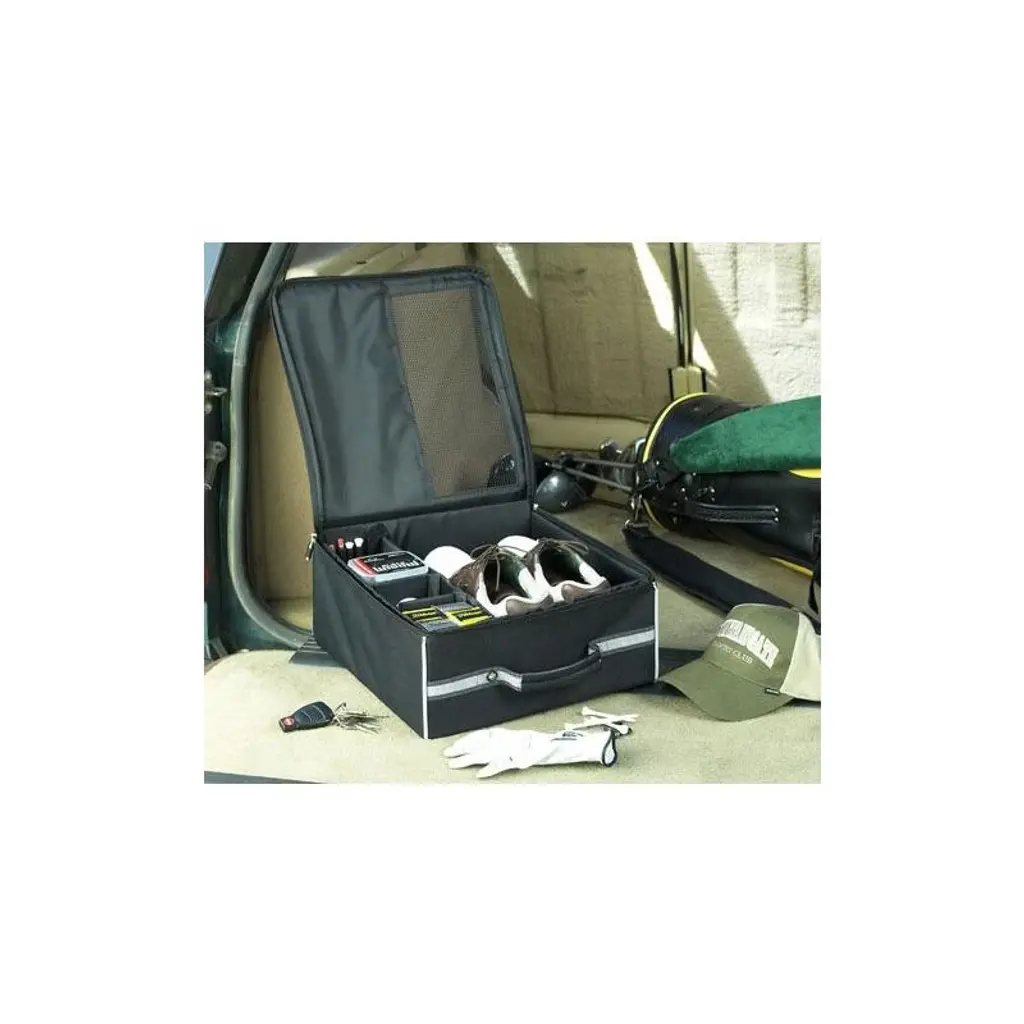 Golf trunk organizer provides storage for shoes, balls, spikes, gloves, tees, and towel. Acts like a golf locker in the car. Ventilation area over the shoe compartment. Folds flat for shipping and storage. Designed and assembled in the USA.