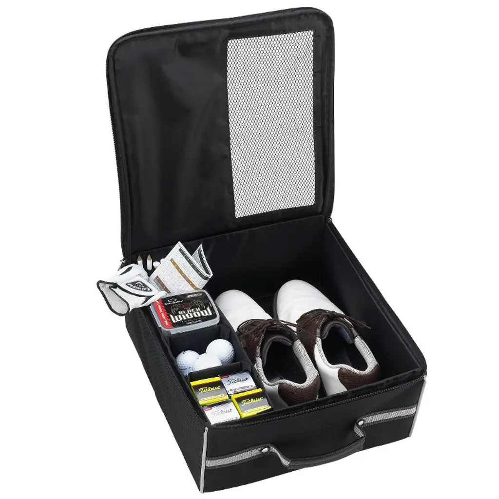 Golf trunk organizer provides storage for shoes, balls, spikes, gloves, tees, and towel. Acts like a golf locker in the car. Ventilation area over the shoe compartment. Folds flat for shipping and storage. Designed and assembled in the USA.