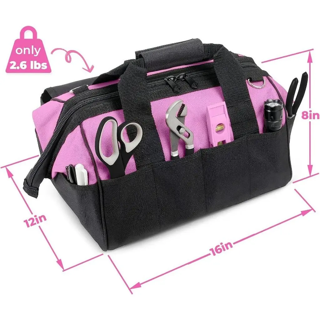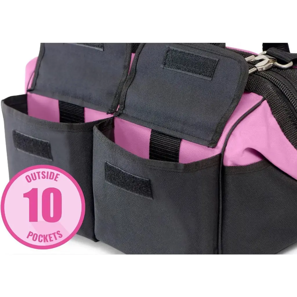 Our 16" pink tool bag features a wide mouth design making it easy to organize and carry all of your tools. To help keep your equipment in place, we have included 10 outside pockets and 12 interior pockets. Two of the exterior pockets feature a Velcro closure to ensure that your hand tools are secure. The heavy-duty zipper ensures that all of your hand tools stay safely tucked away during transportation. This small to midsize nylon zipper tool bag features a padded shoulder strap to make carrying tools easier and more comfortable. The additional double strap handle with Velcro closure allows for comfort and better stability while moving the bag. Each bag also come with three exterior latches making it so the shoulder strap can be easily removed. The interior and exterior of the bag is made from a heavy-duty nylon. The nylon lined interior prevents any stains and helps resists spills. The exterior nylon material helps protect against water, dirt and grime found in most work areas. The bag comes with a reinforced bottom to help protect tools and supplies from hard falls and the four attached rubber feet protect work surfaces. Our mid-size 16" tool bag for ladies can be used as a portable tool box and is perfect for keeping all your tools, art and crafting supplies, gym clothes, gardening equipment or hair styling tools organized and in one place.